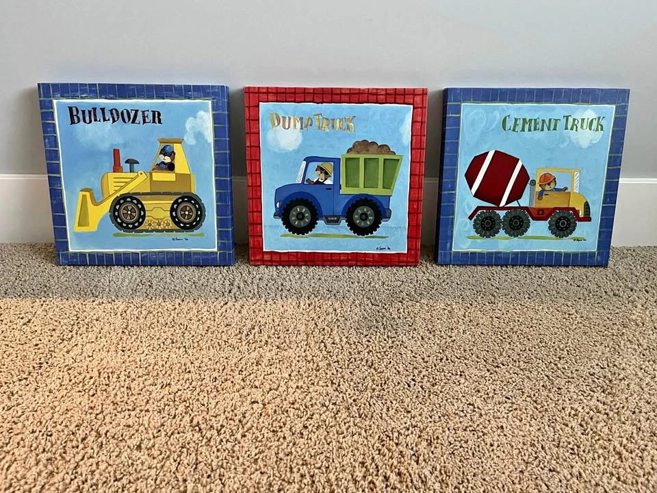VGUC set of 3 colourful construction vehicles raised canvas children’s art work. Bulldozer, dump truck, and cement truck. Measures 11.5 inches. Porch pick up west Maple Ridge.