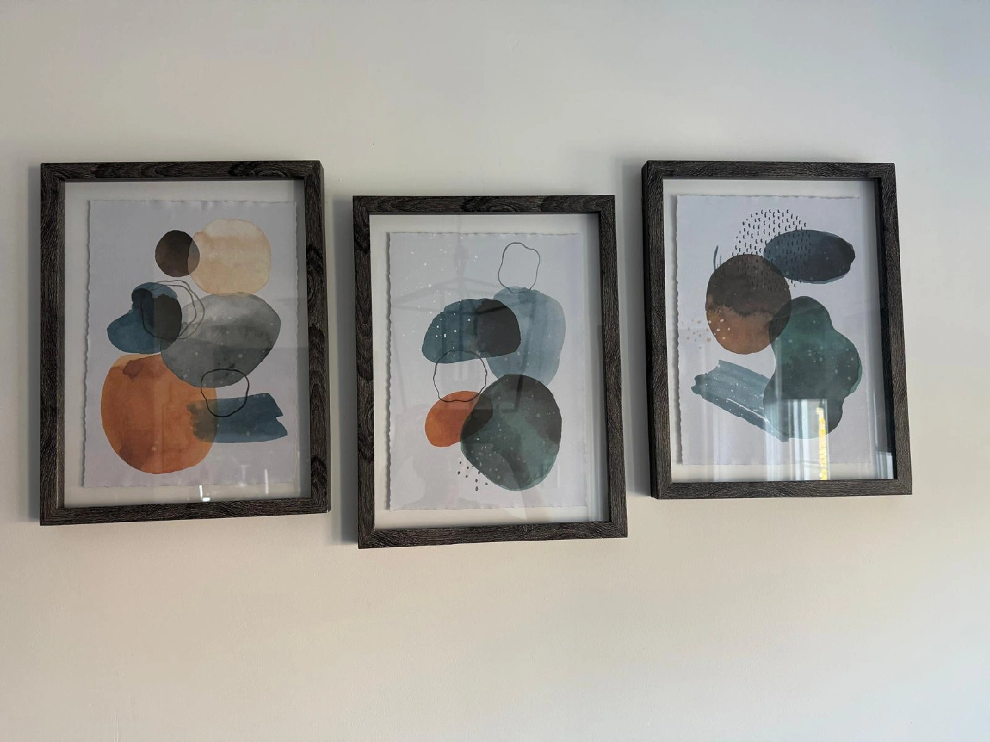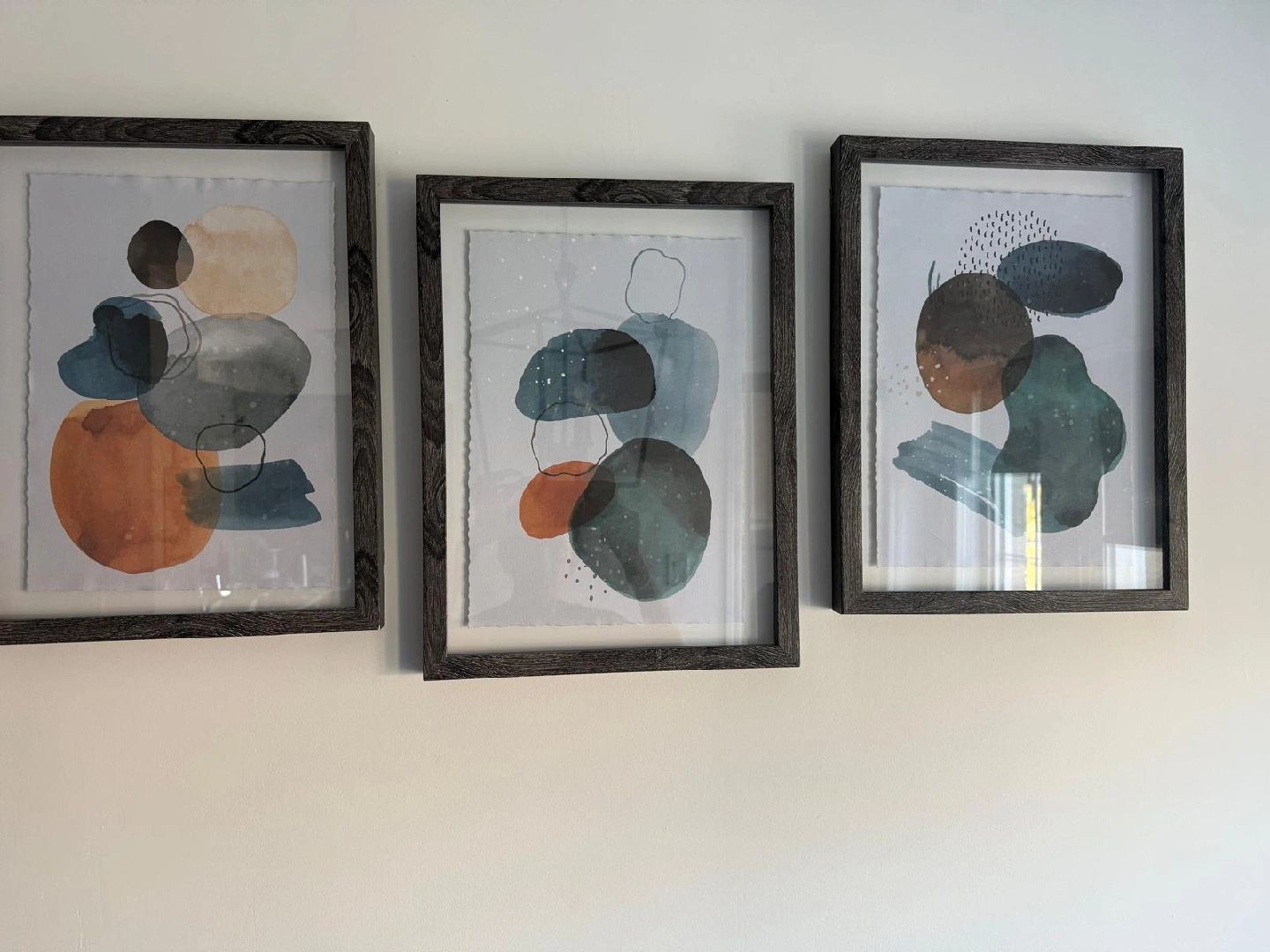 Selling a set of three framed abstract prints. They are in great condition and ready to hang!
