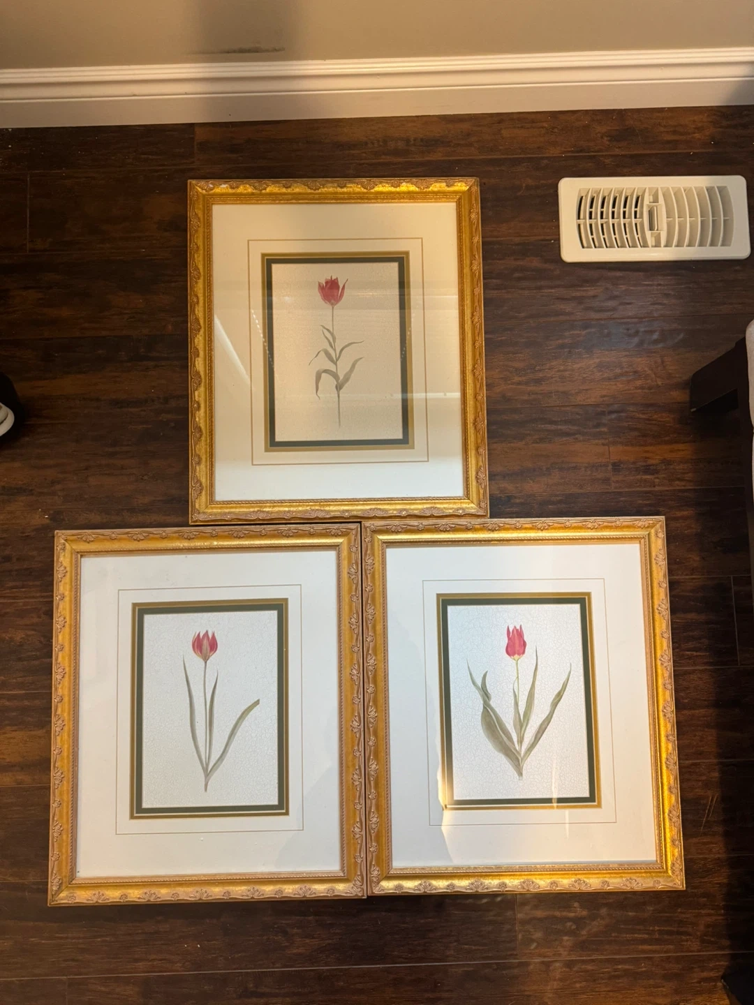 Selling a set of three framed tulip prints from Decorators Gallery. These prints feature a simple yet elegant tulip design and are framed in gold. Perfect for adding a touch of floral charm to your home decor
