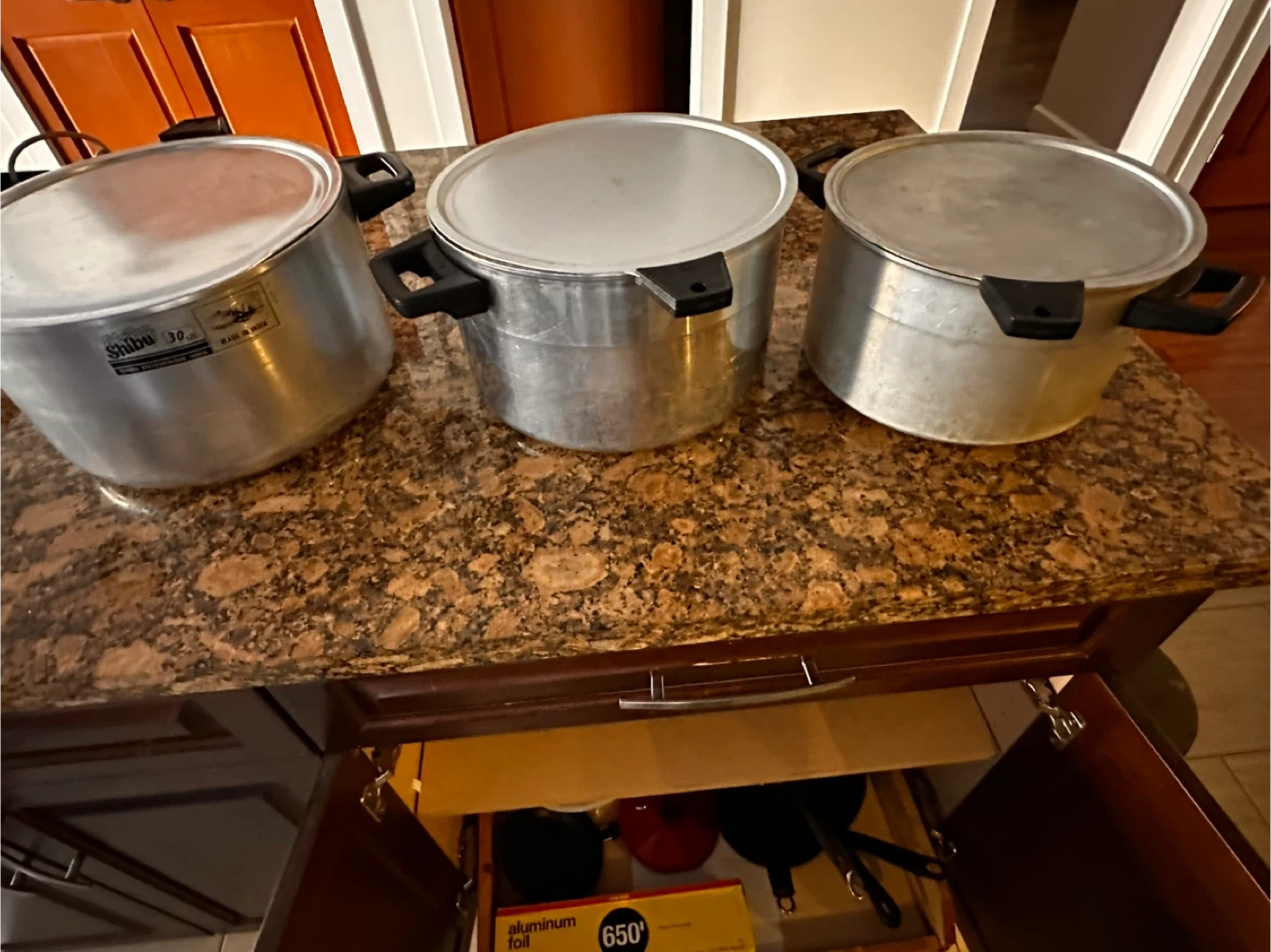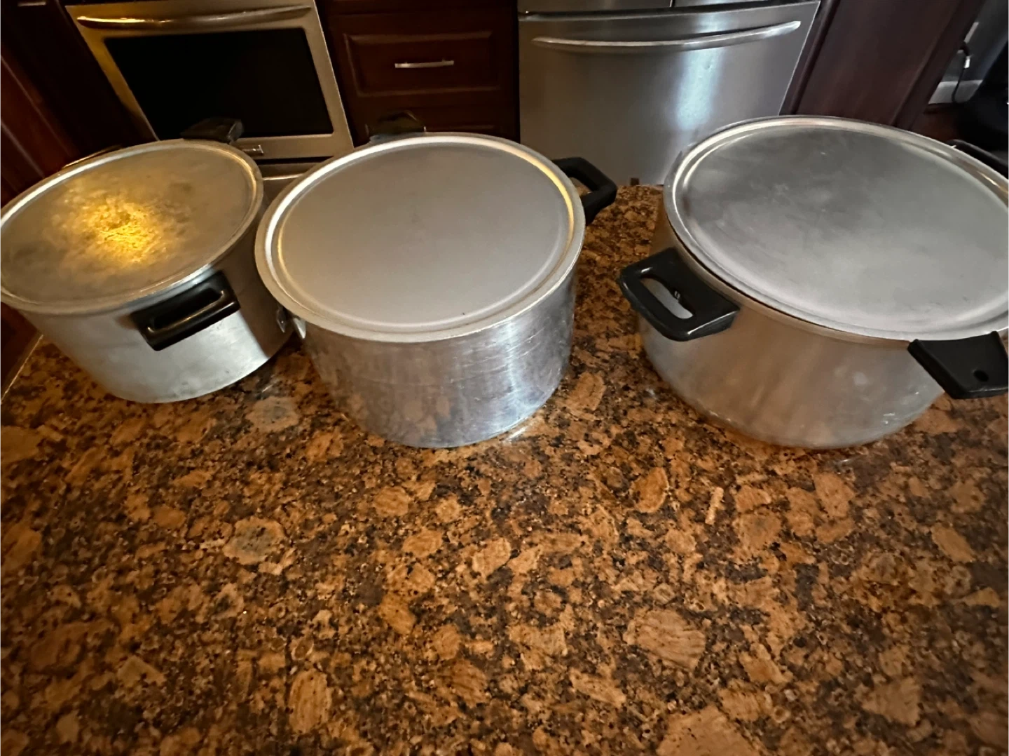 Selling a set of three aluminum stock pots. They're in good used condition and ready for your next big cooking project! One is missing one handle