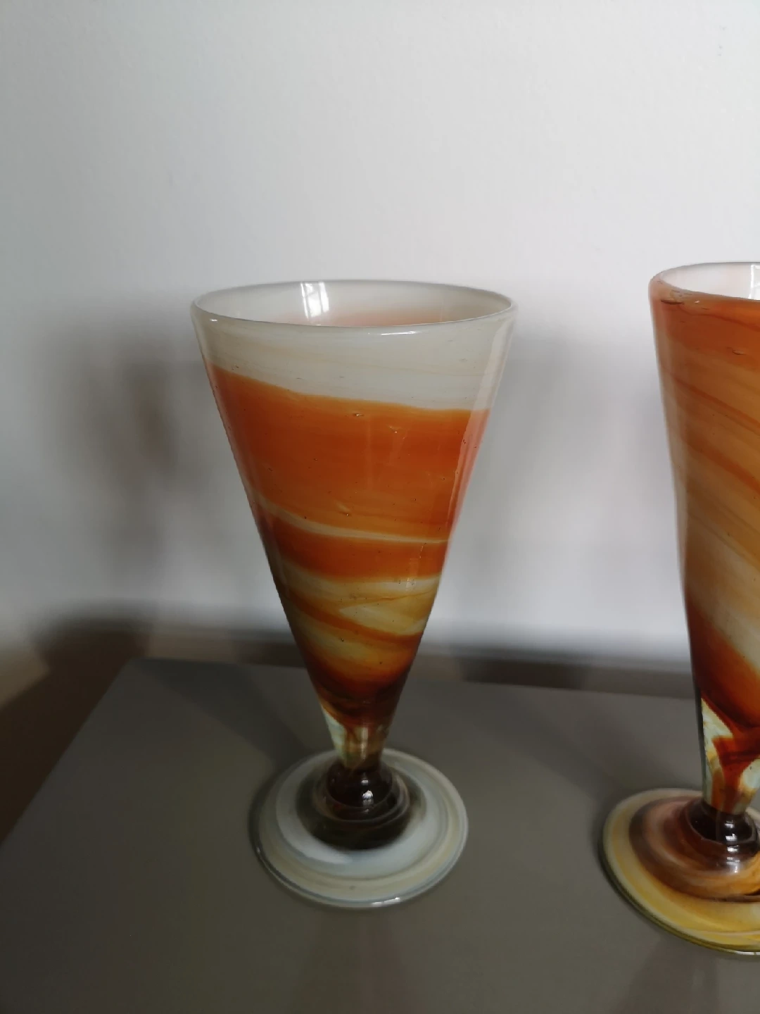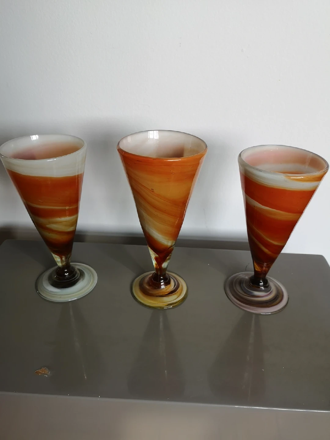 Selling a set of three unique art glass cups. They feature a beautiful swirl pattern with orange, white, and brown tones. These cups would make a lovely addition to any home decor