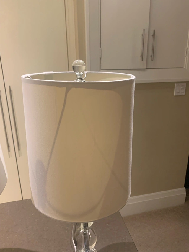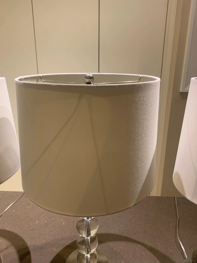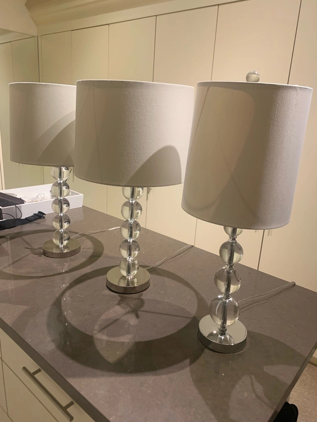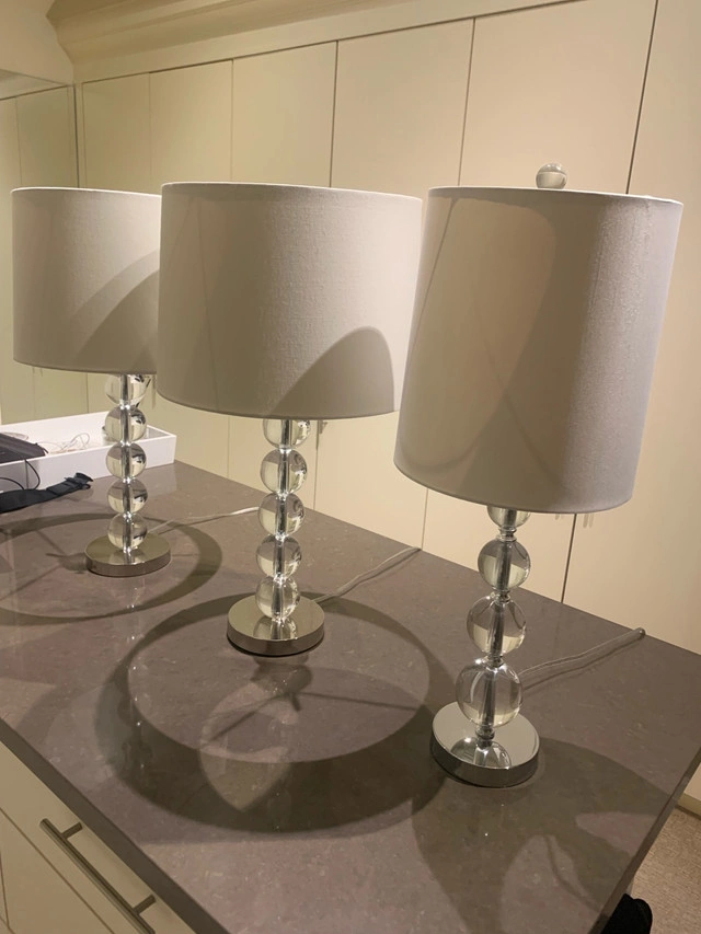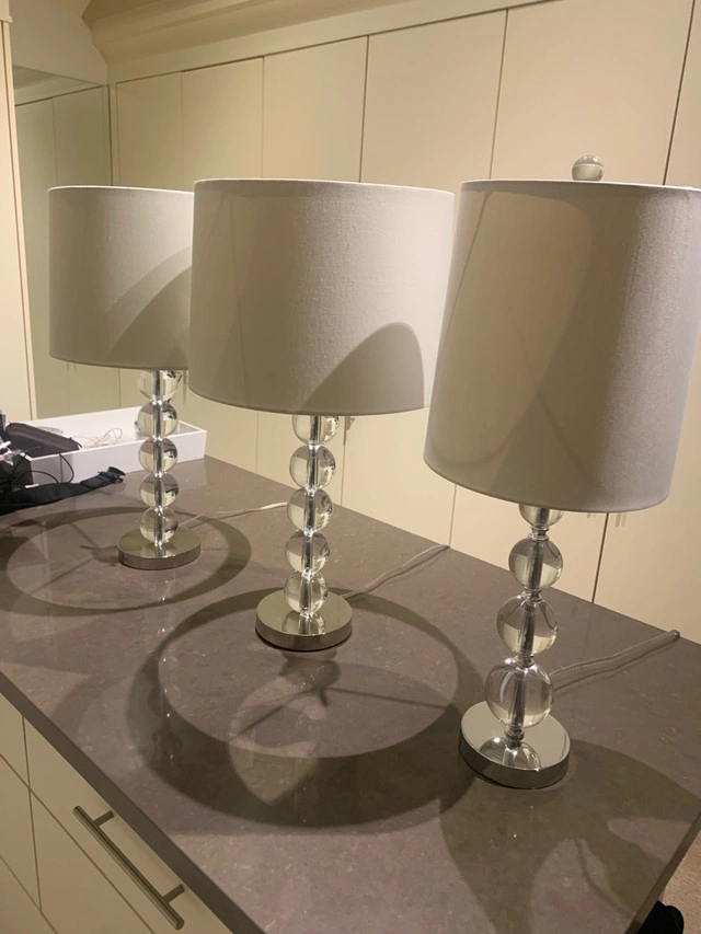 Illuminate your space with this elegant set of three table lamps, each featuring a crystal-beaded base and a neutral-toned shade. These lamps are in great condition. Perfect for adding a touch of sophistication to your bedside tables or living area! They are all the same height - 25” Additional details: * Base Material: Crystal, Chrome * Shade Material: Fabric * Style: Modern * Number of lamps: 3 If the ad is up, it's available! Don't miss out on giving your home a little sparkle.