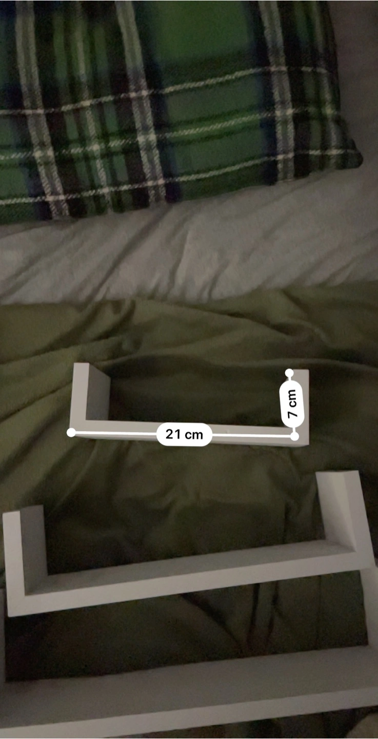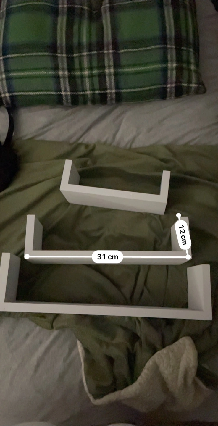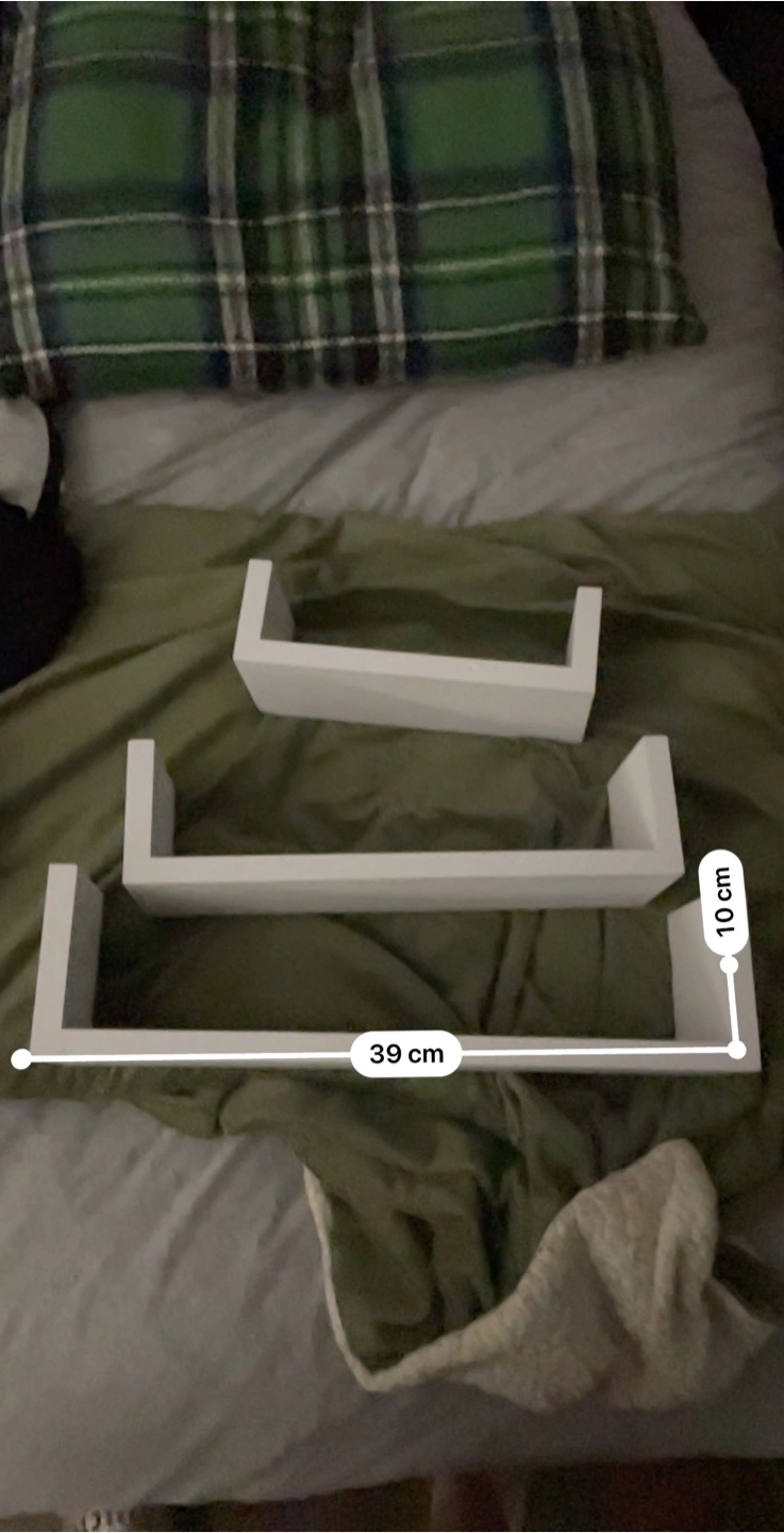 Selling a set of three white floating shelves! The dimensions are: - 39cm x 10cm - 31cm x 12cm - 21cm x 7cm They're perfect for adding a touch of style to any room