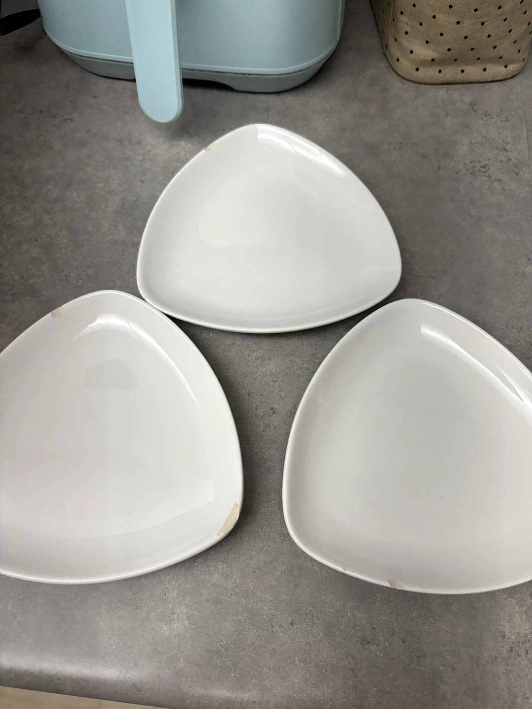 Selling a set of three white triangle plates. They have some minor chips on the edges, as shown in the pictures. Perfect for snacks, appetizers, or desserts! Pick up only please