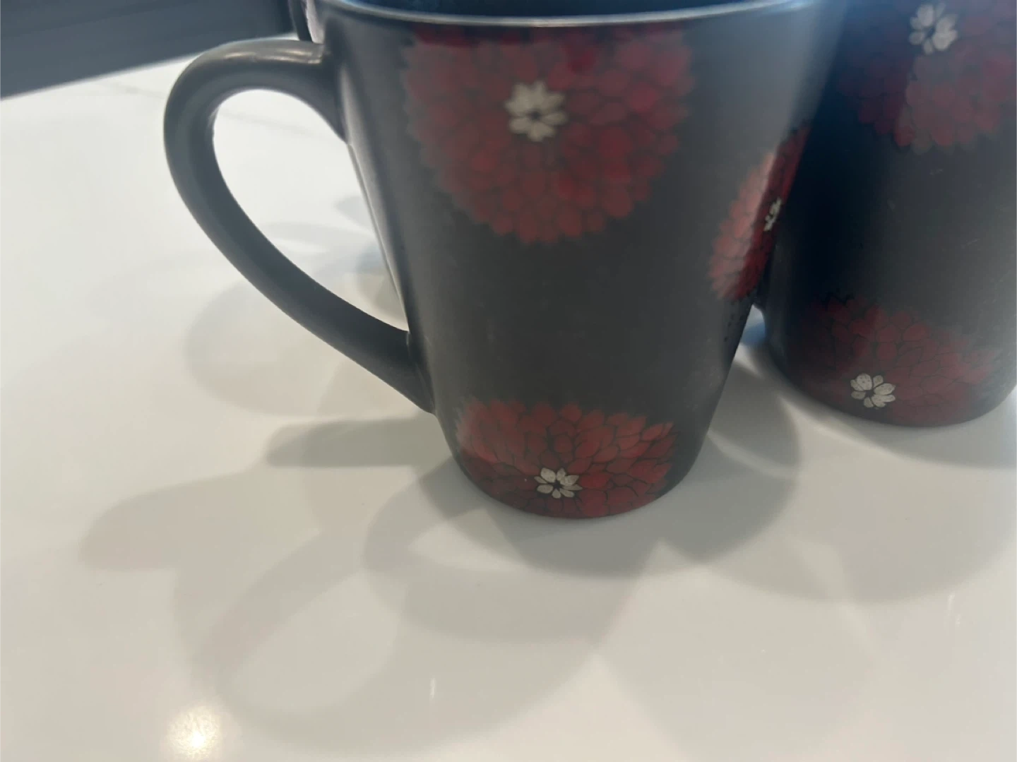 Selling a set of four mugs in great condition! They are black with a red and white floral pattern. Perfect for coffee, tea, or any beverage of your choice