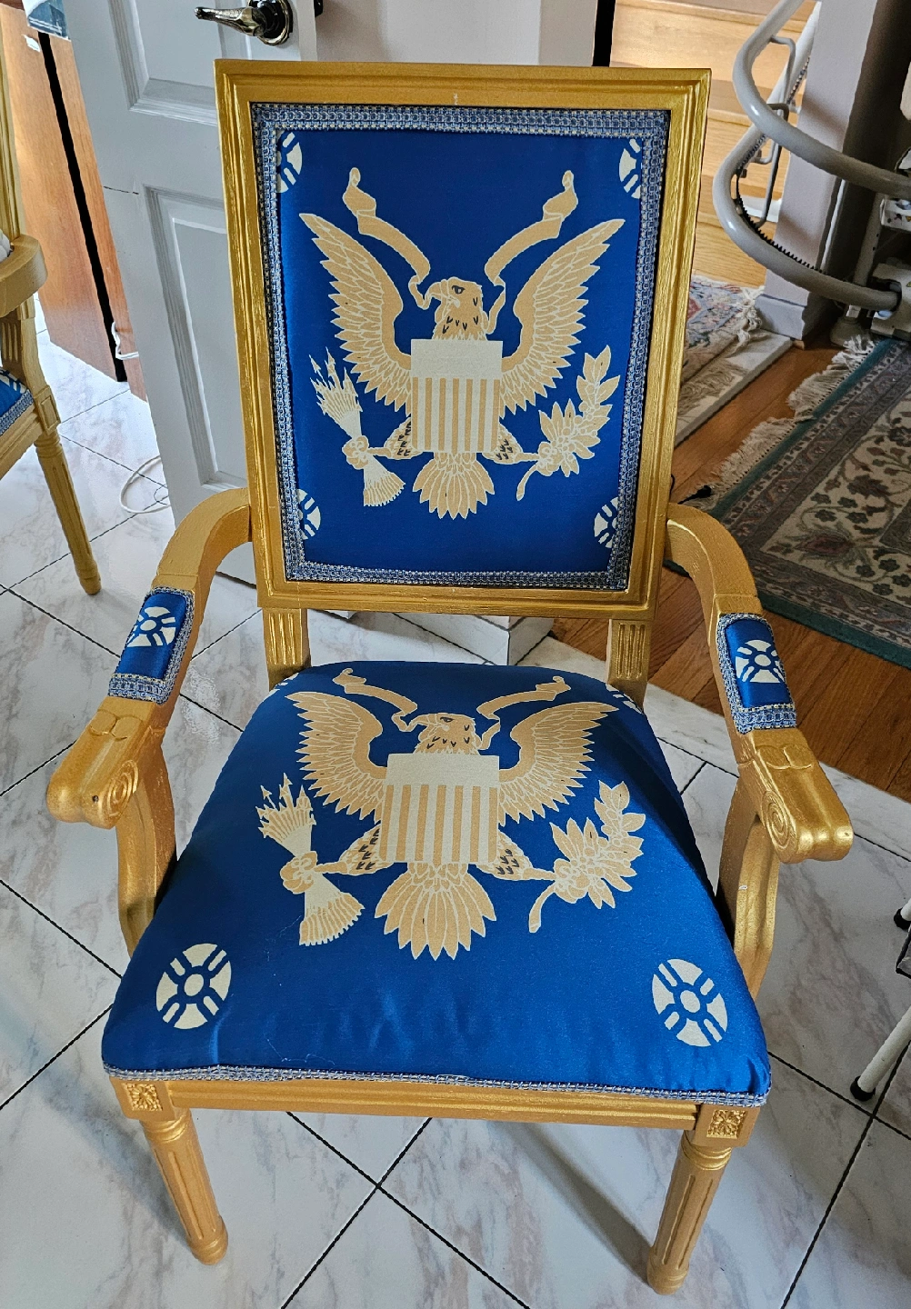 Selling 4 unique accent chair from the popular tv show "The Boys" featuring a striking blue and gold U.S presidential design. The chairs have a sturdy frame and comfortable seating, perfect for adding a touch of elegance to any room.