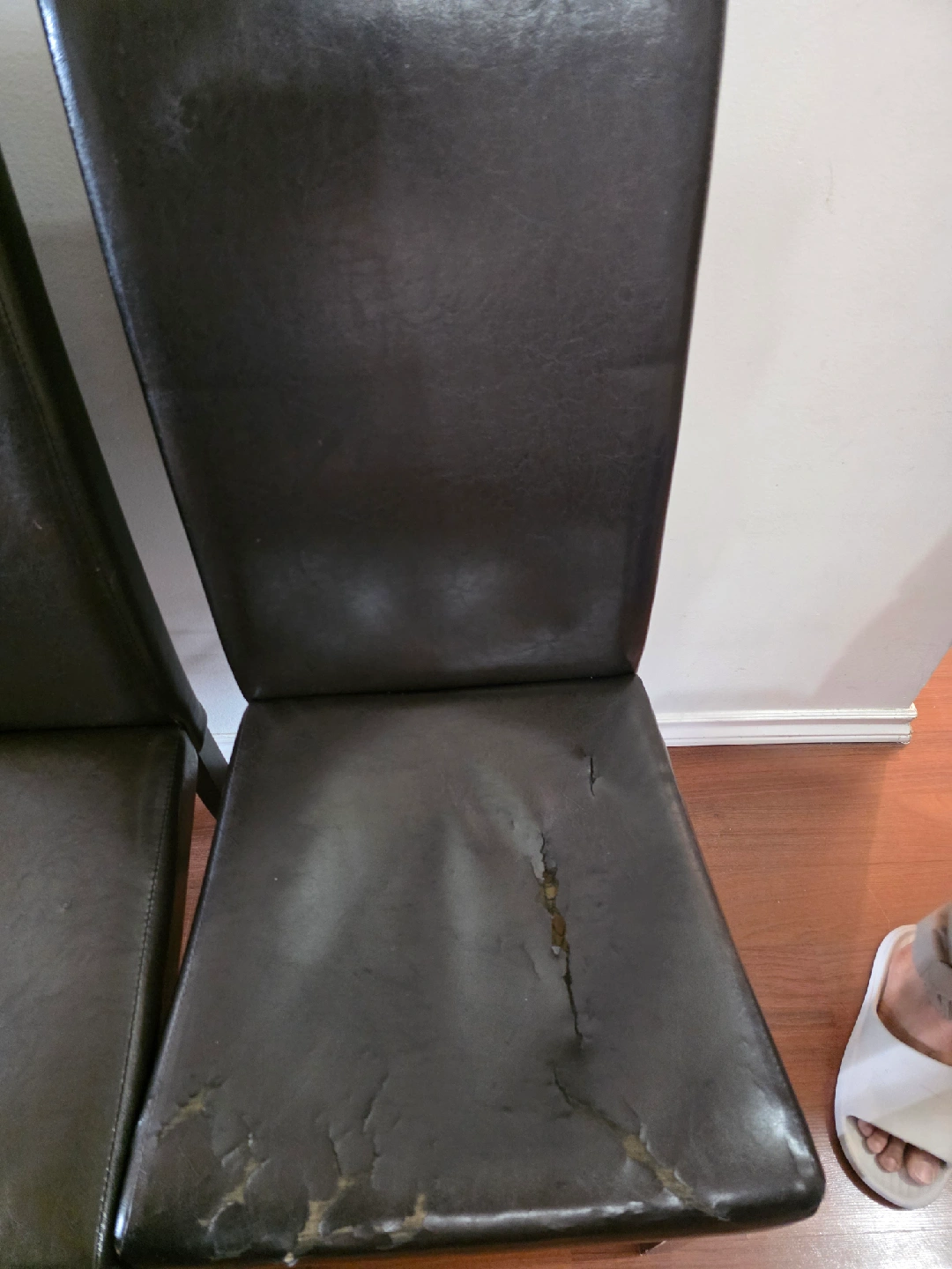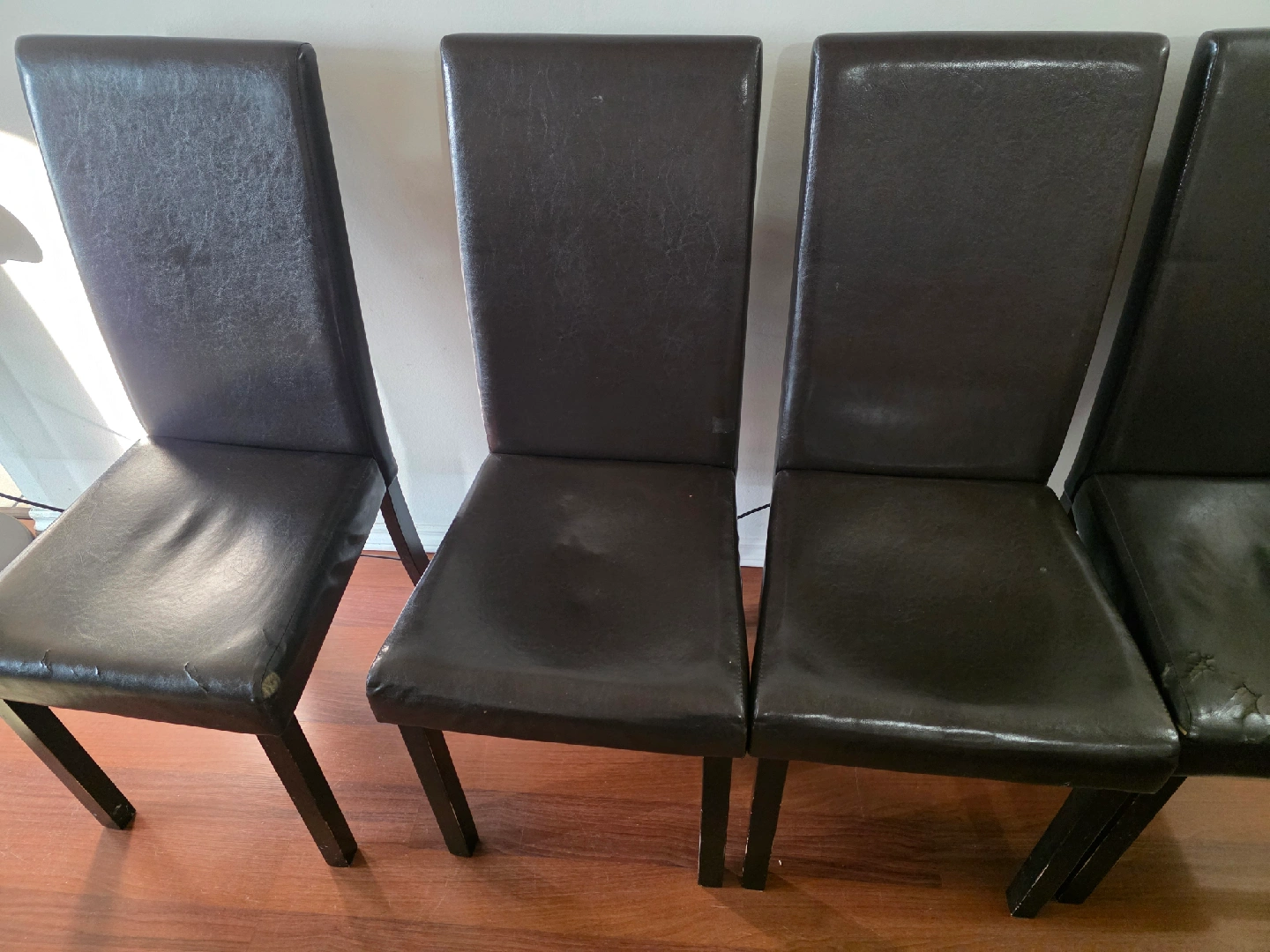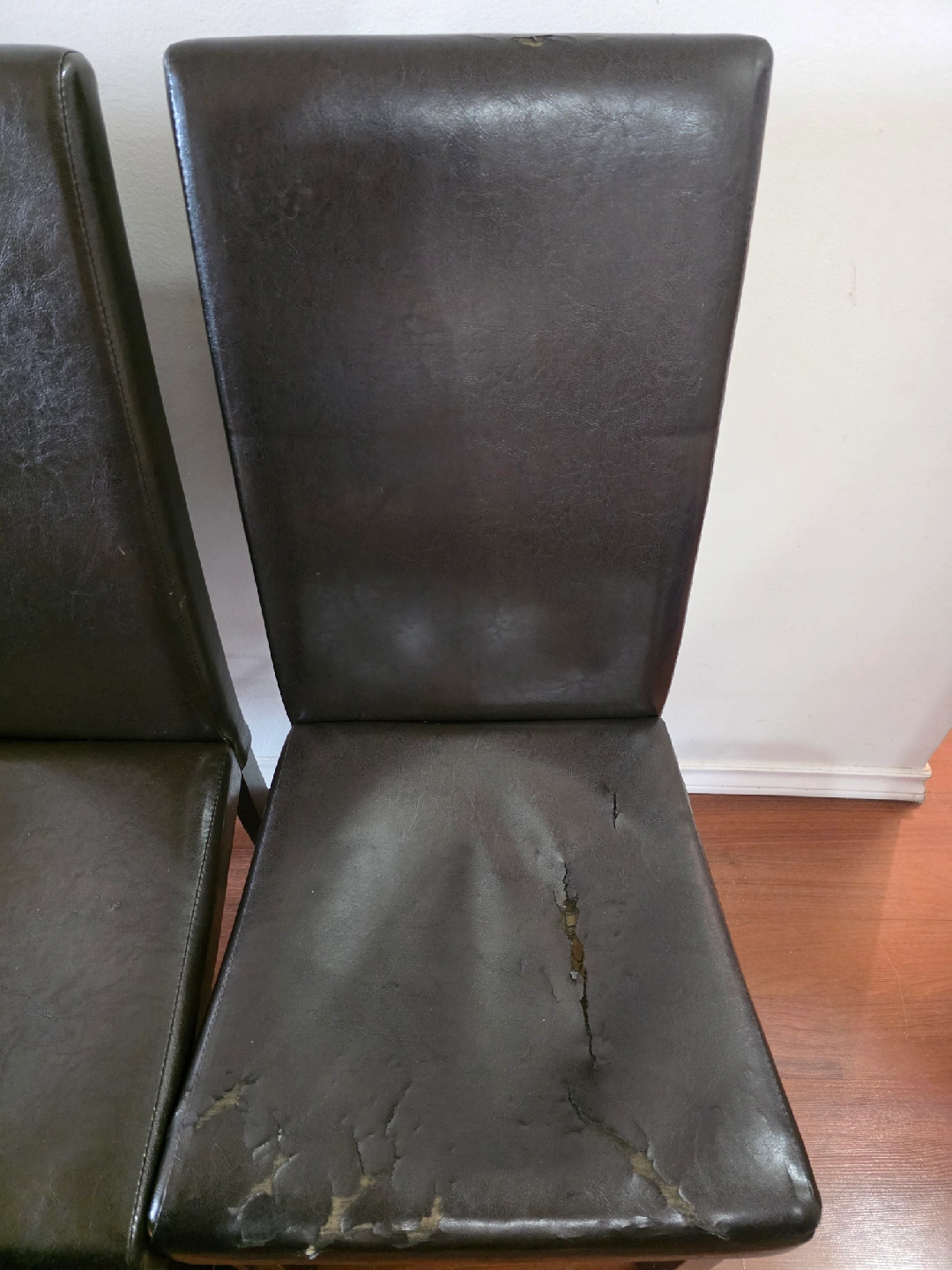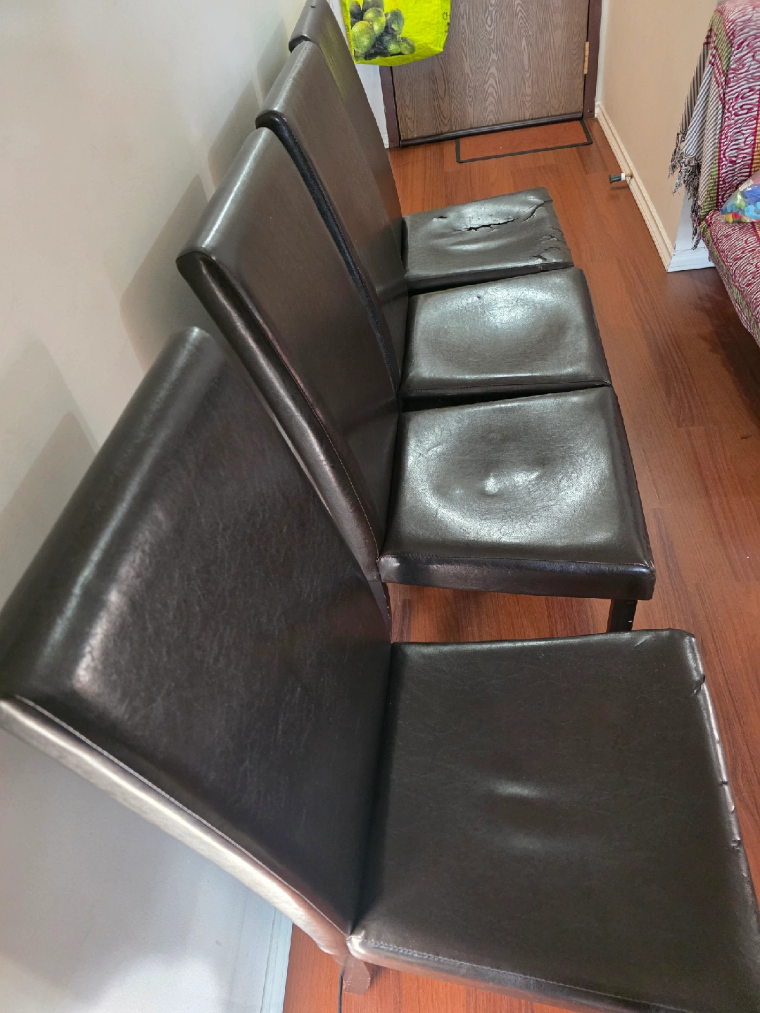 Selling a set of four brown dining chairs. They show signs of wear on the seats, as pictured. Still sturdy and functional, perfect for a budget-friendly dining set! only 1 chair has seat is torn but still usable. all for $20.