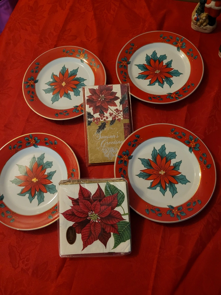 4 ceramic plates with a red poinsettia pattern, 2 paper napkins featuring the same poinsettia pattern.