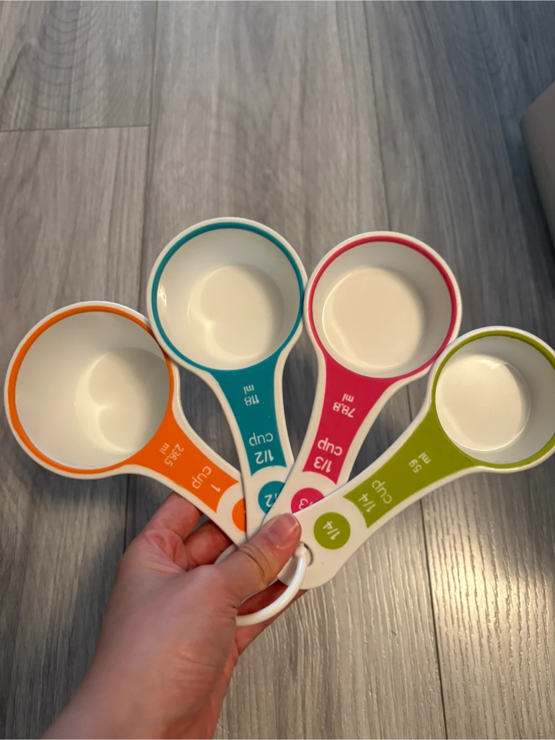 Here's a set of four measuring cups in various sizes and colours! Each cup is marked with both cup and milliliter measurements, making them super handy for baking and cooking. The sizes include 1/4 cup (59 ml), 1/3 cup (78.8 ml), 1/2 cup (118 ml), and 1 cup (236.5 ml)