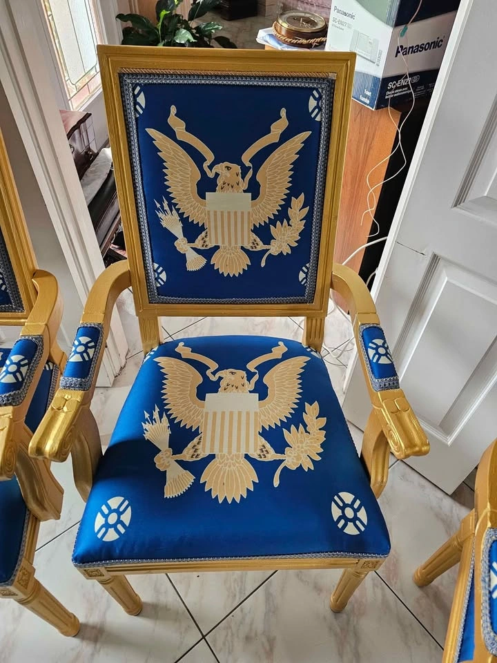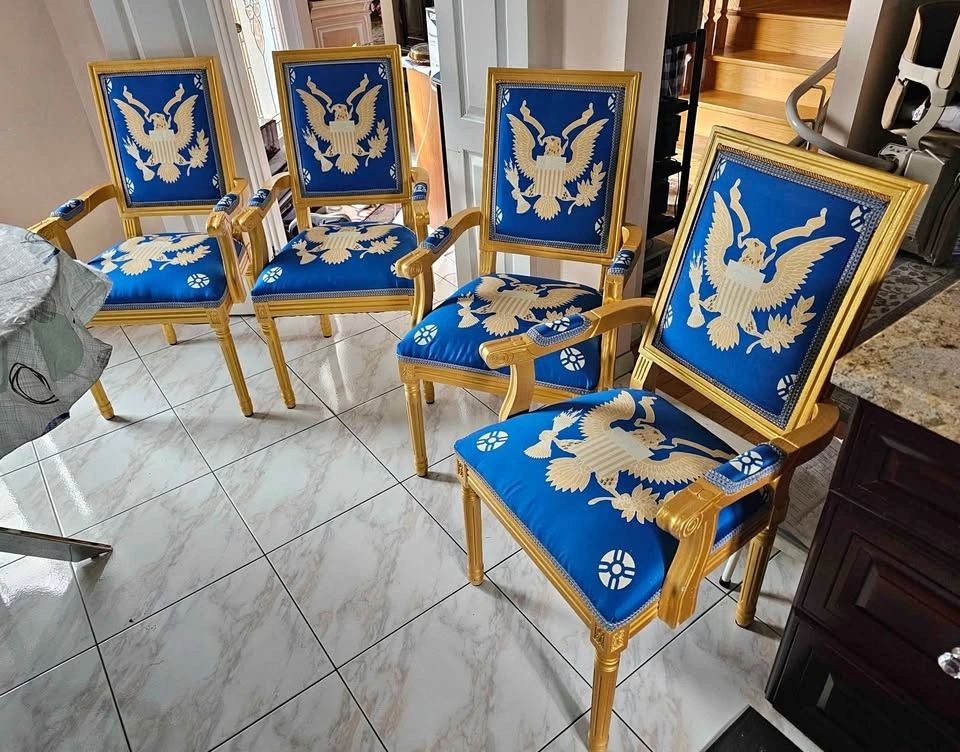 Selling 4 unique custom presidential accent chairs from the popular tv show "The Boys" featuring a striking blue and gold U.S presidential design. The chairs have a sturdy frame and comfortable seating, perfect for adding a touch of elegance to any room.