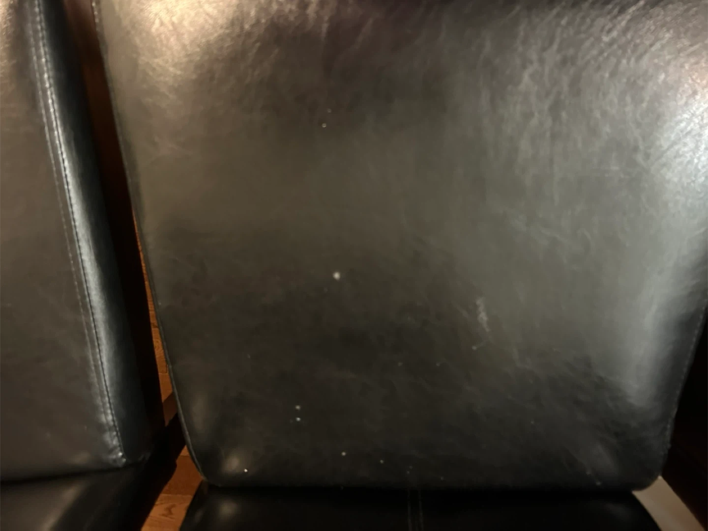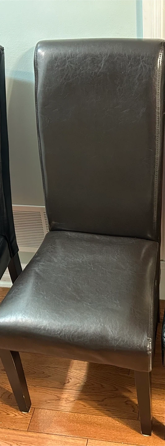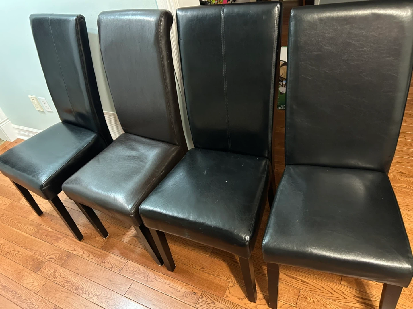 Selling a set of 4 dining chairs. They're a dark brown colour and made of fake leather. They have a classic, simple design that would fit in any dining room. They are in used condition.