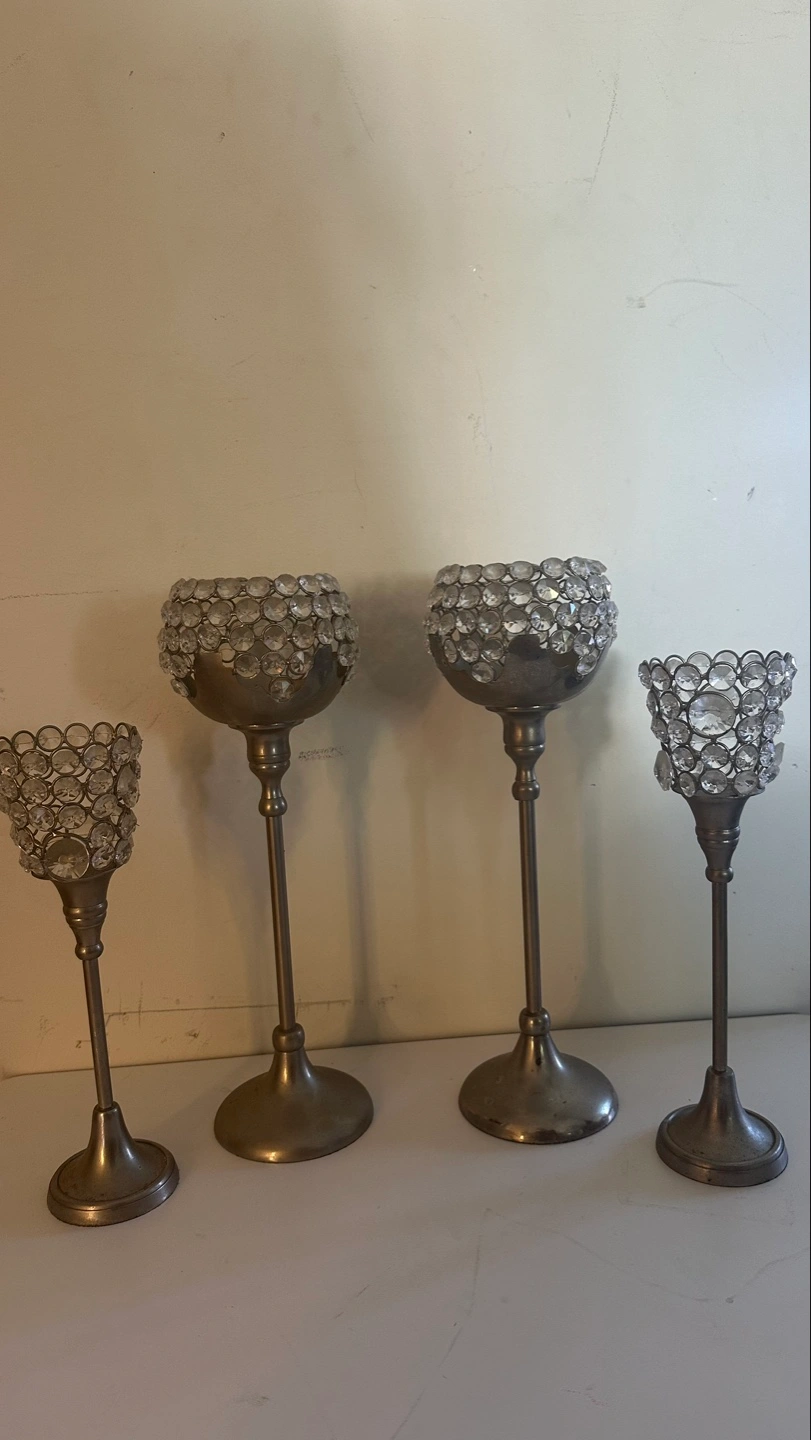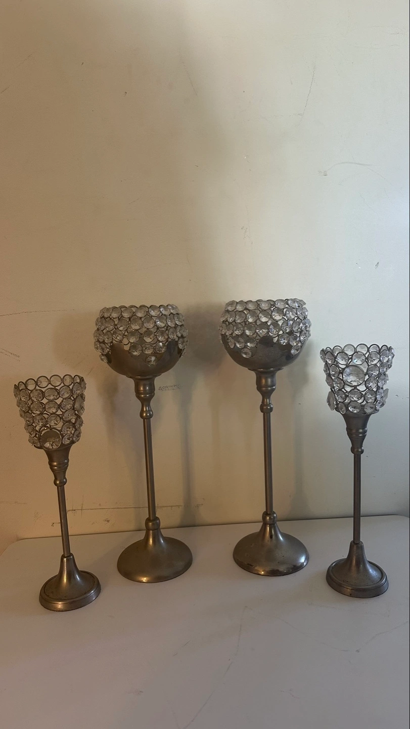 Here's a set of four decorative candle holders! They have a metallic finish with beaded detailing around the top. They come in varying heights, perfect for adding a touch of elegance to any room
