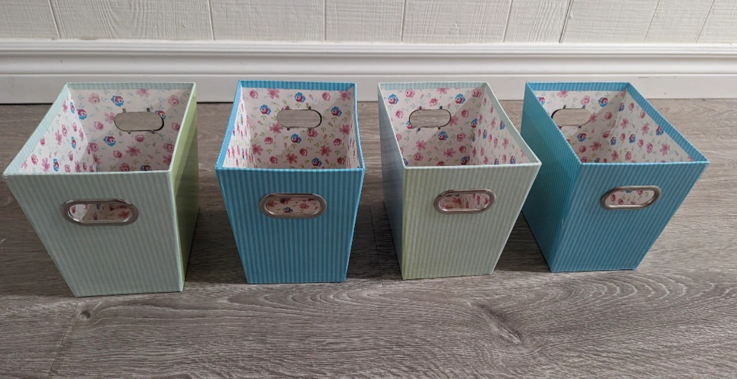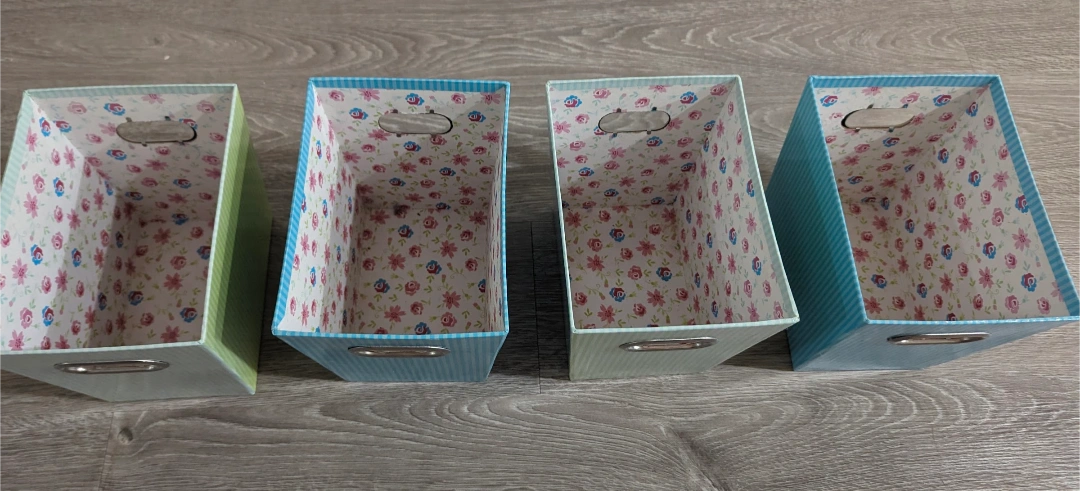 Selling a set of four cute decorative storage bins! They're in great shape and perfect for organizing your space. The bins have a floral pattern on the inside and come in two colours: light green and light blue. They each have a silver handle.