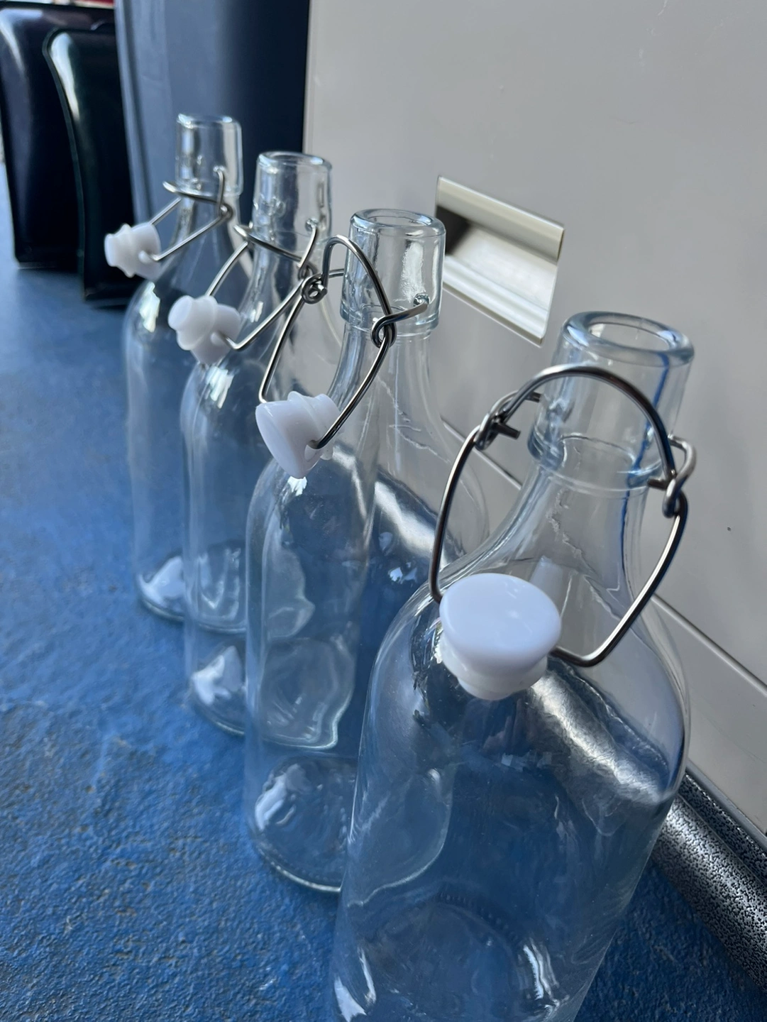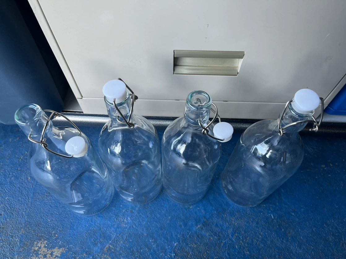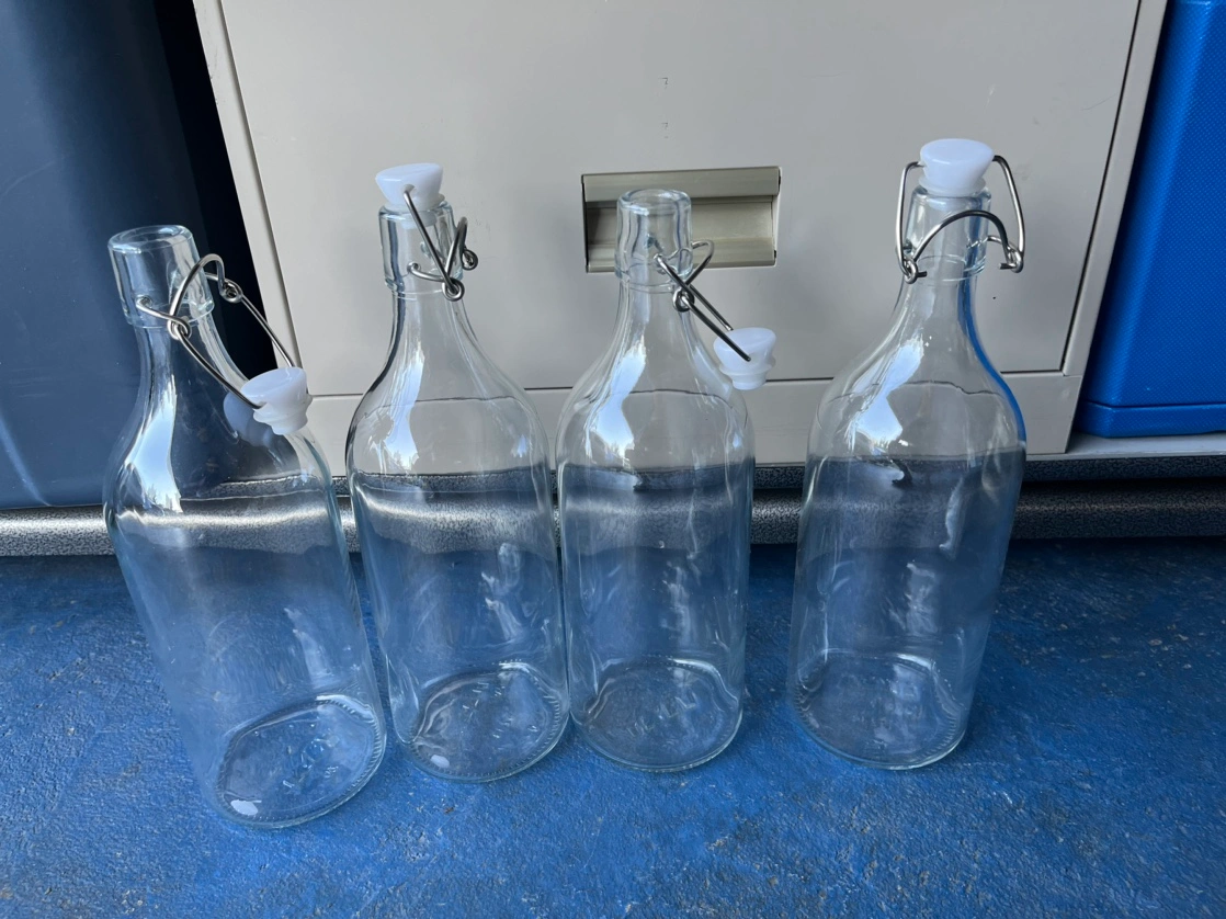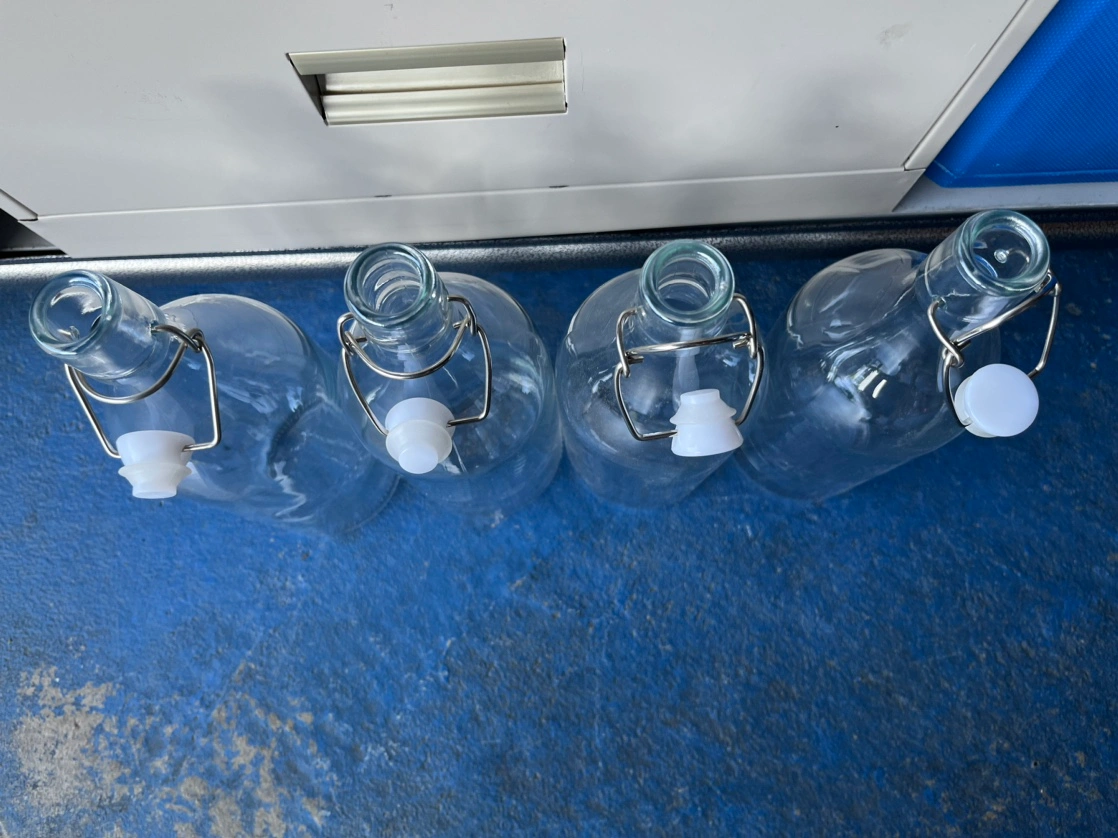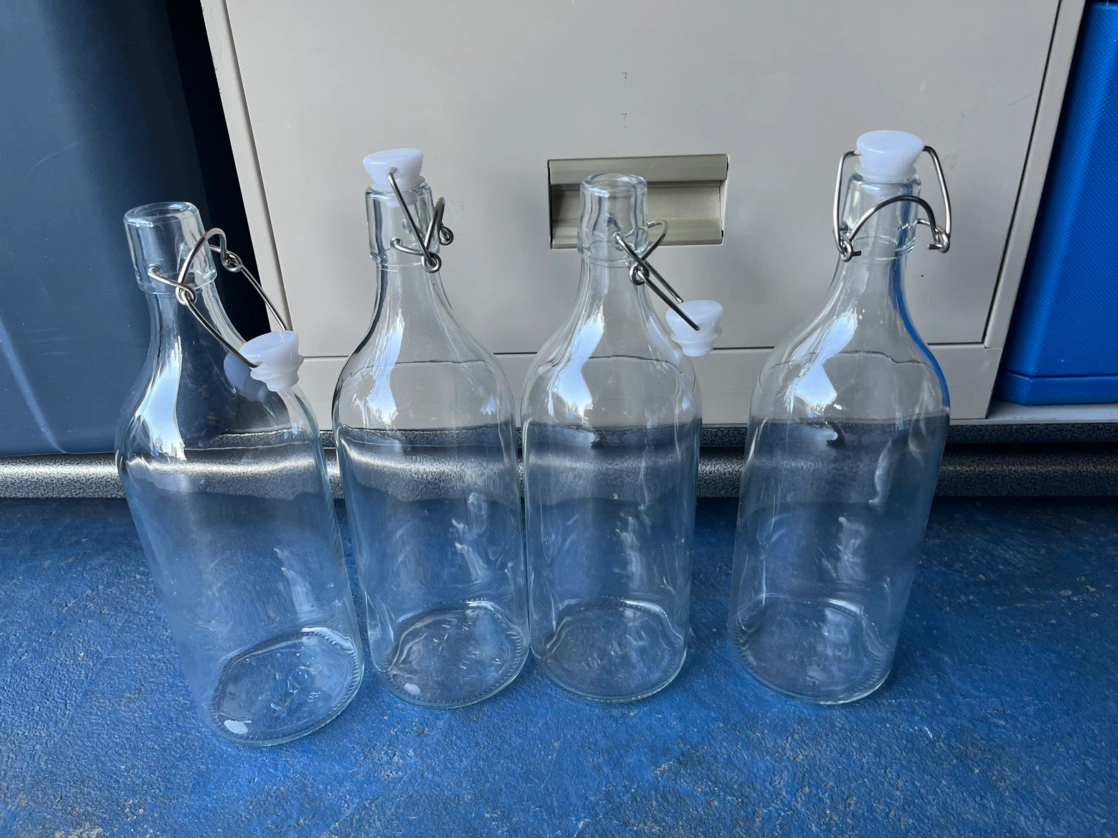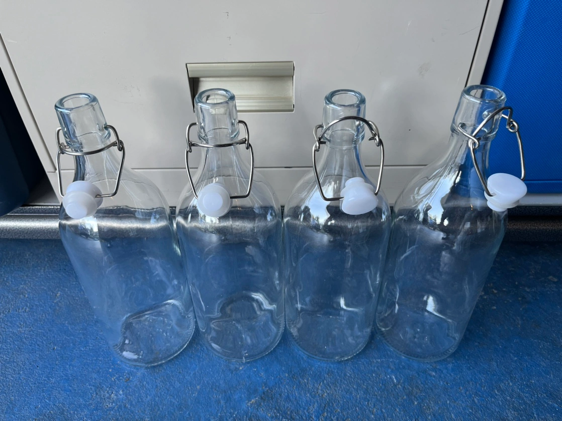 Set of 4 glass bottles with swing tops. Perfect for storing beverages, oils, or other liquids.