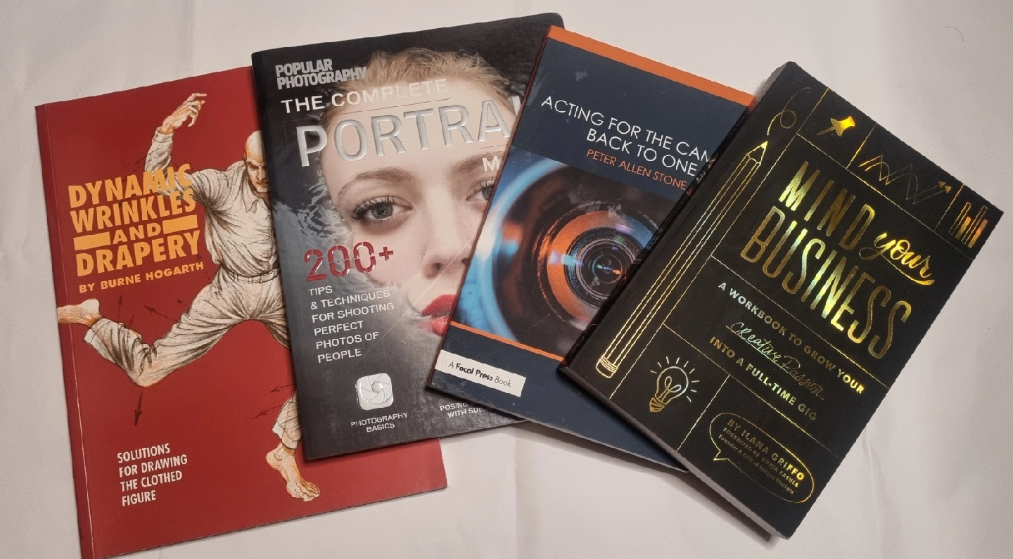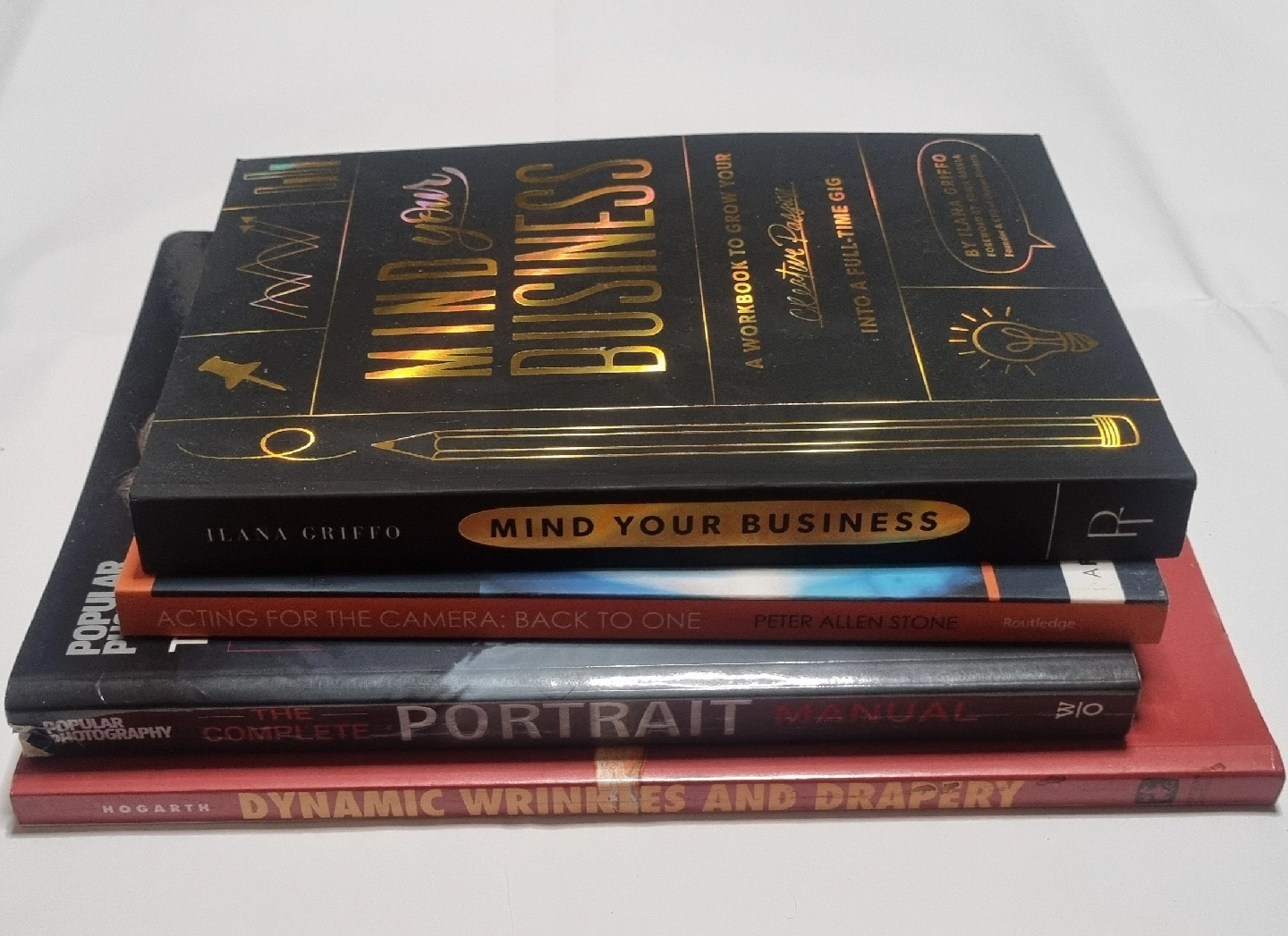 Selling a set of four books, perfect for anyone interested in business and the arts: - Mind Your Business: A Workbook to Grow Your Creative Passion Into a Full-Time Gig by Ilana Griffo - Acting for the Camera: Back to One by Peter Allen Stone - The Complete Portrait Manual - Dynamic Wrinkles and Drapery by Burne Hogarth