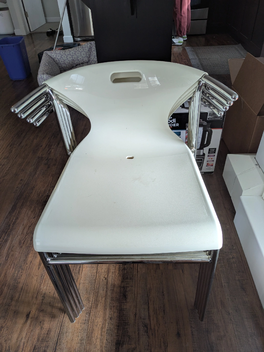 Selling a set of four white stacking chairs! They're in great shape and perfect for adding extra seating to your home. The chairs have a sleek, modern design with chrome legs. They're also easy to store since they stack neatly. Great for small spaces!