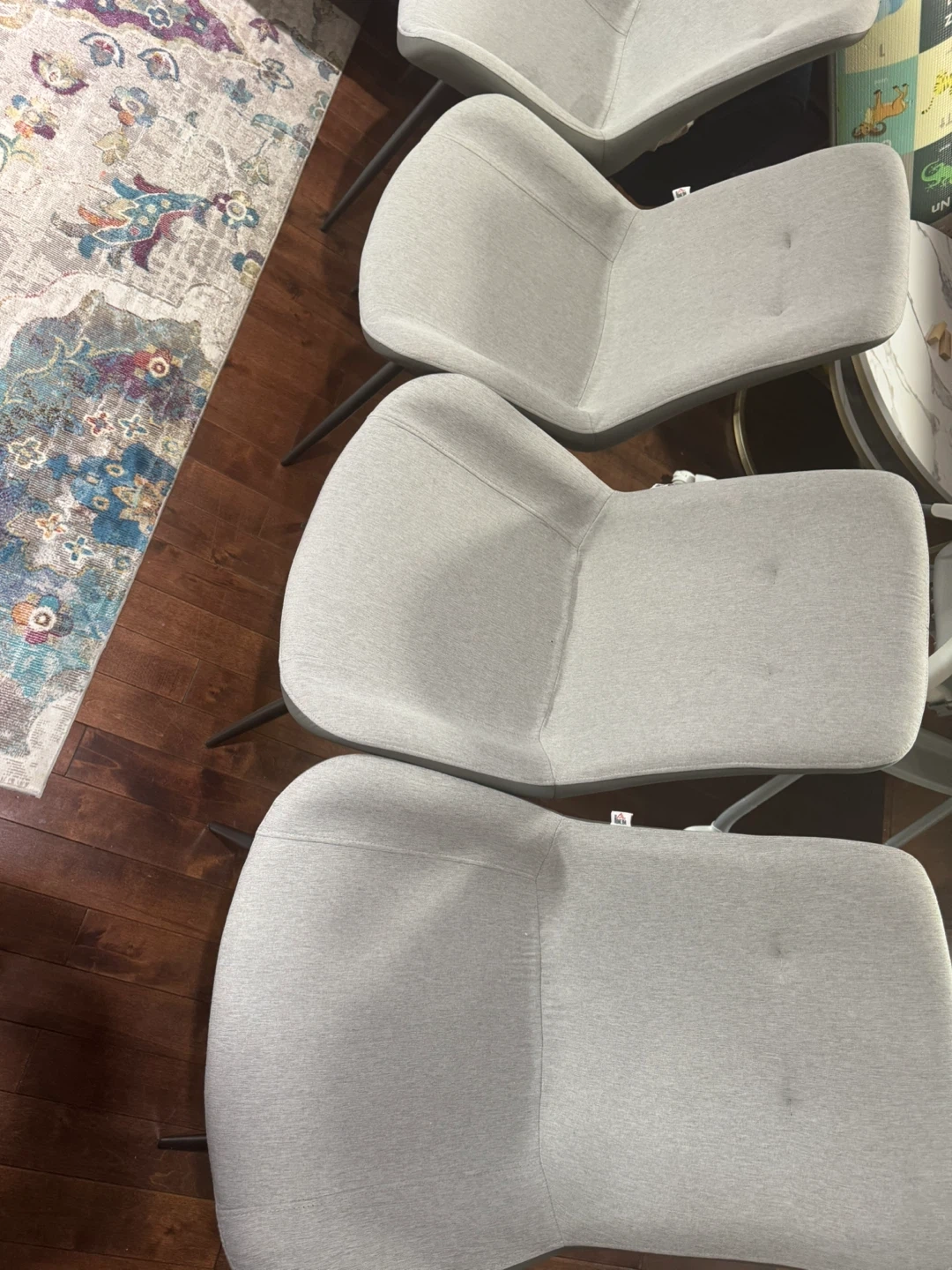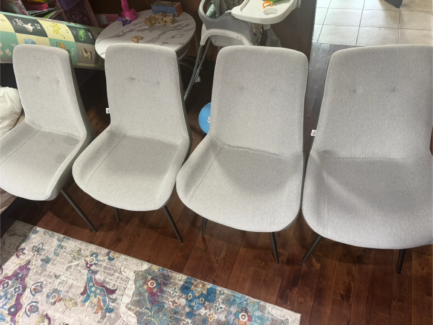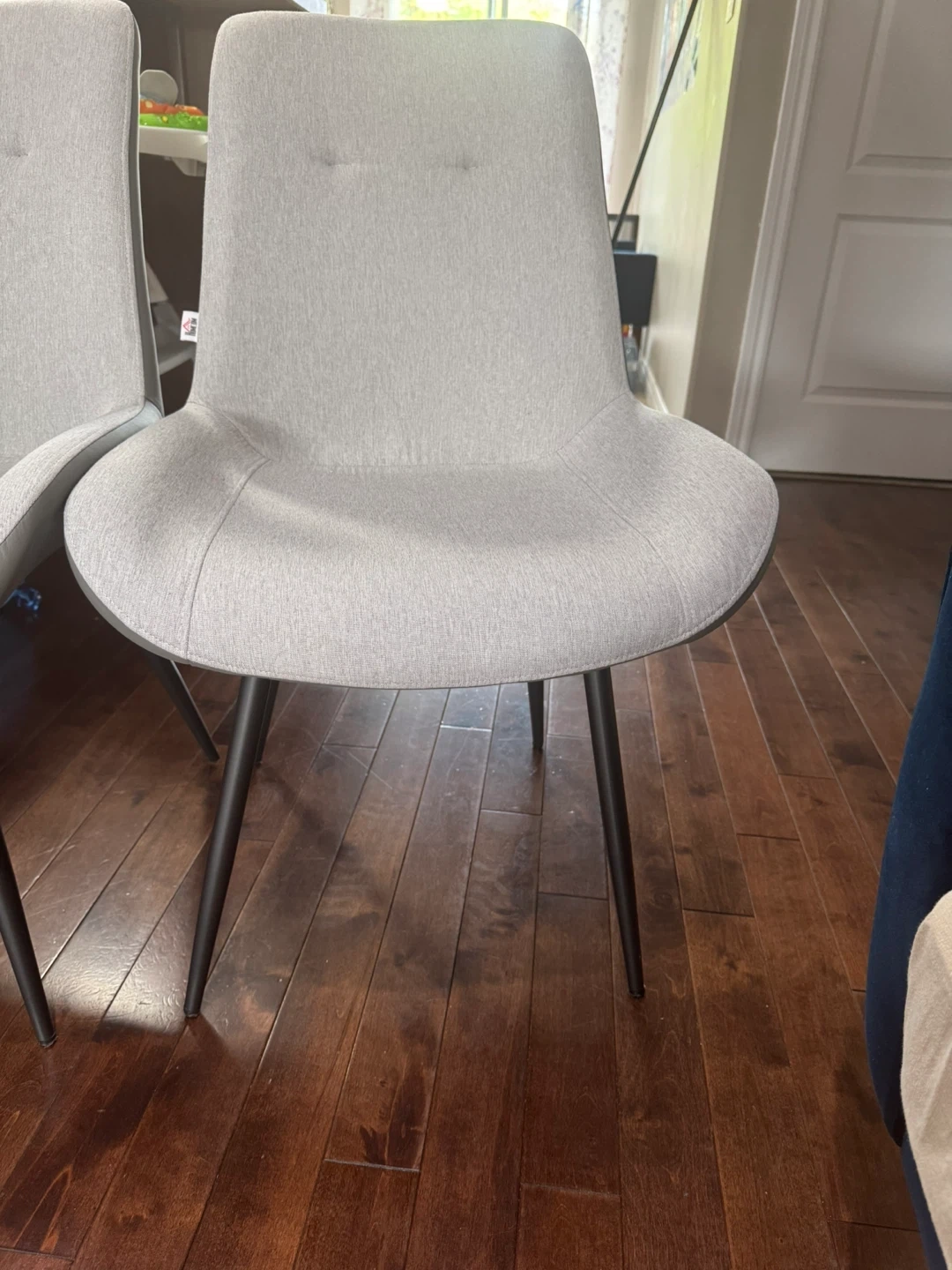 Selling a set of 4 dining chairs in a light grey colour. They're in great shape and would look great in any dining room or kitchen. The chairs have a simple, modern design with metal legs. They're also comfortable to sit in for extended periods of time. If you're interested, please send me a message!