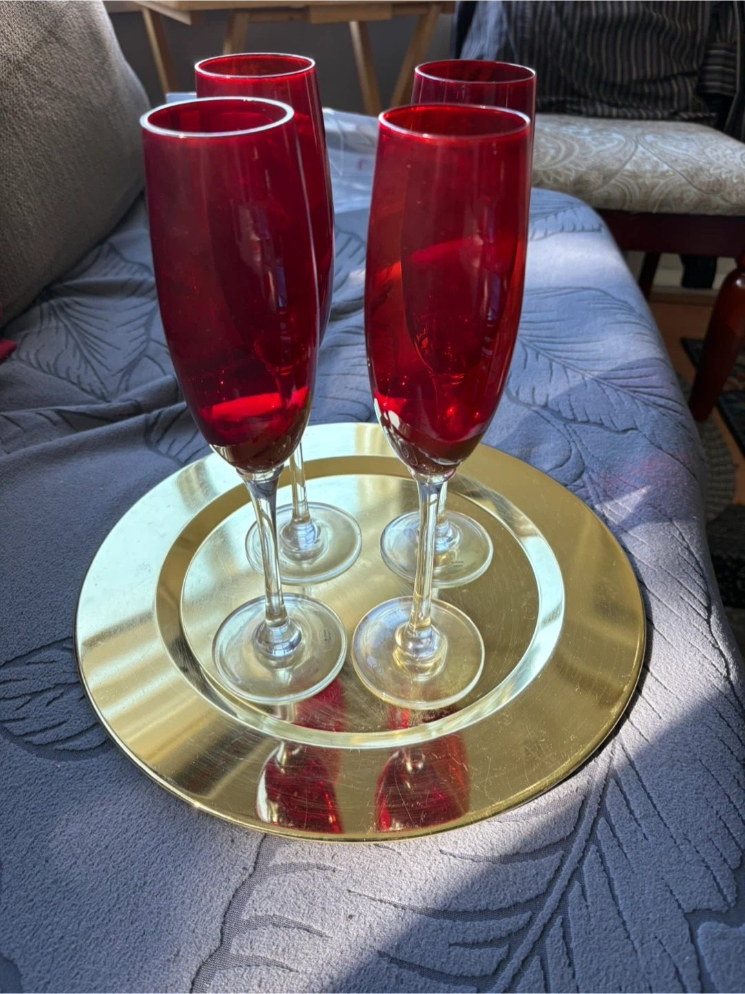 Selling a set of four beautiful red champagne flutes. They're in great condition and would be perfect for any celebration or special occasion! Gold plate free