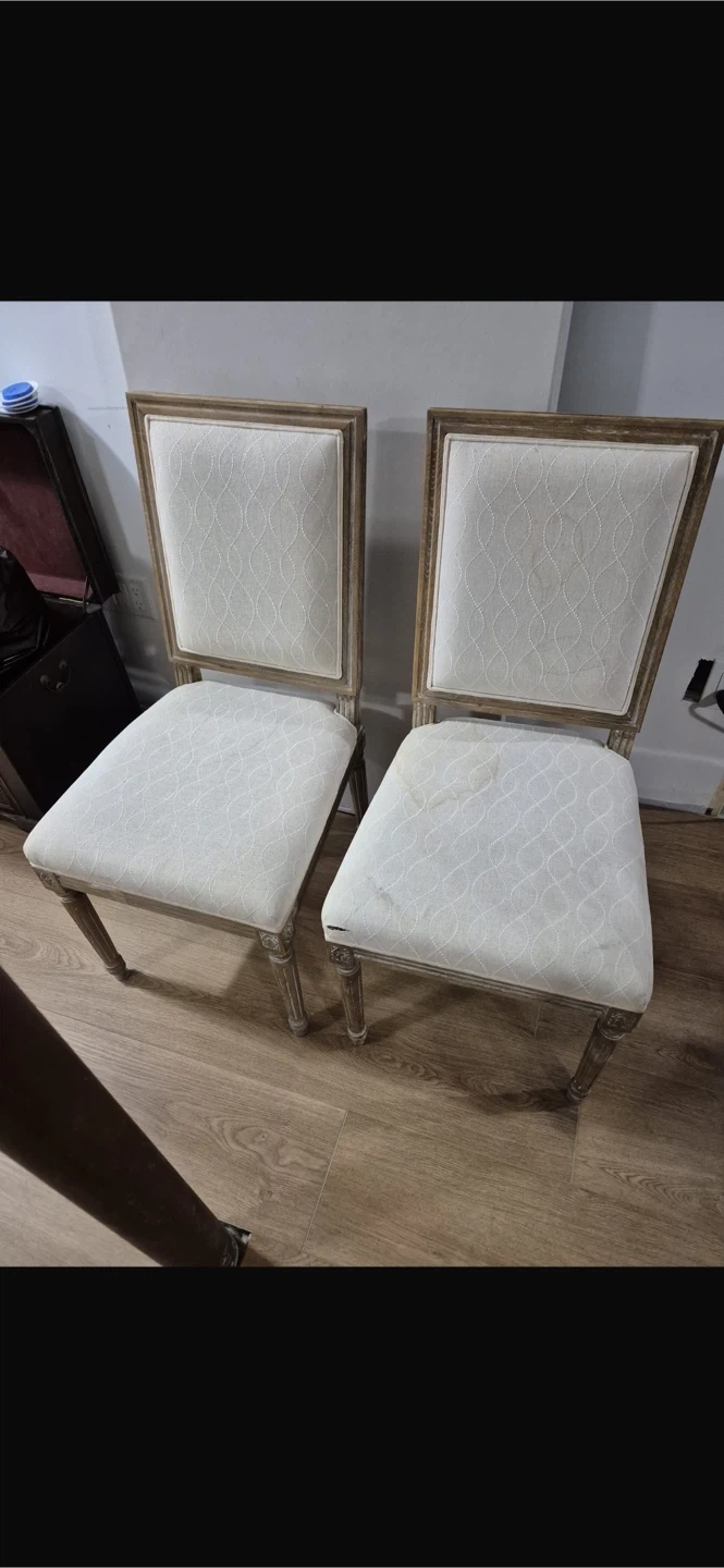 Selling a set of 4 upholstered dining chairs. They are in good condition and perfect for adding a touch of elegance to your dining space. The chairs feature a neutral-toned fabric with a subtle pattern and a light-colored wooden frame. There are some signs of wear on the seat of one of the chairs.