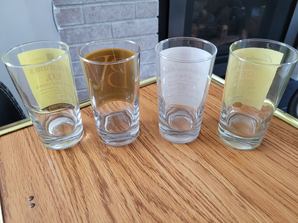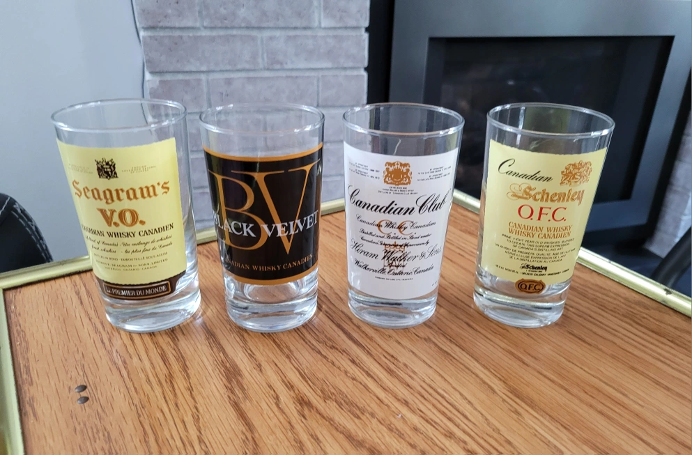 Set of 4 Vintage Canadian Whisky Glasses. Seagram’s VO, Black Velvet, Canadian Club & Schenley O.F.C. collectible bar glasses. Selling as set Only. $40 East Regina Cash Only