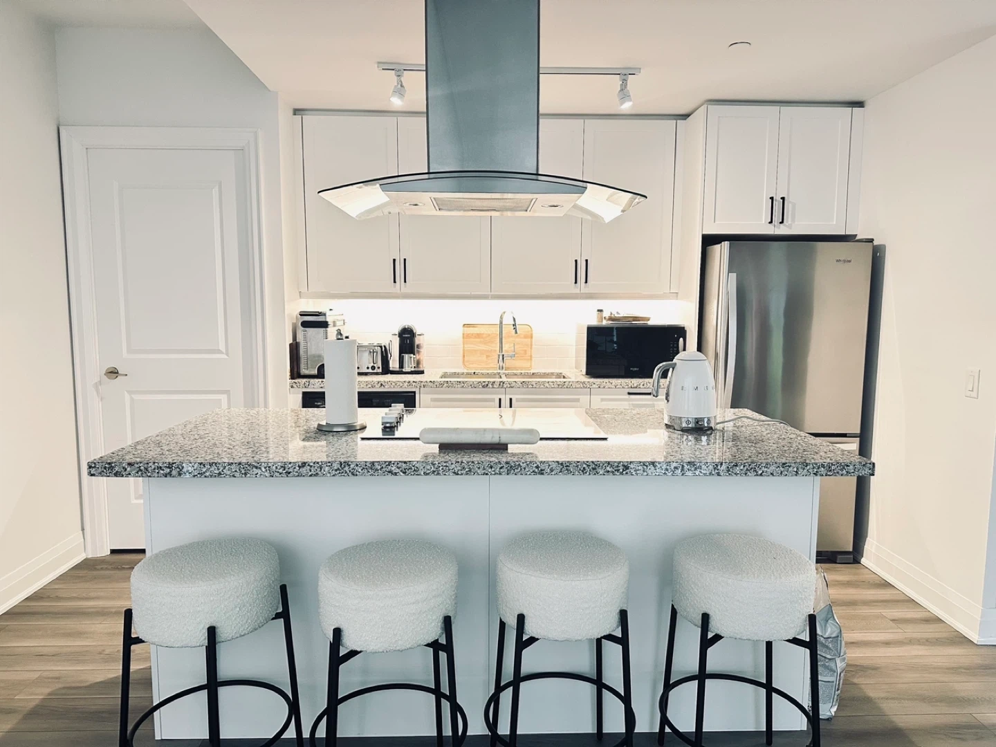 Selling a set of four bar stools. They're in great shape and would look lovely in any kitchen or bar area. The seats are a soft white colour with a textured finish, while the legs are a sleek black metal. Perfect for adding a touch of modern elegance to your space!