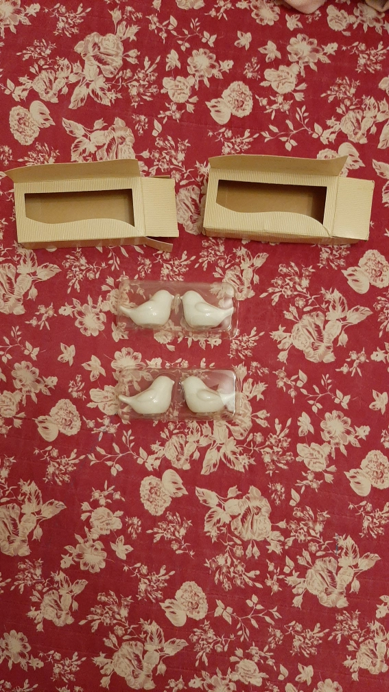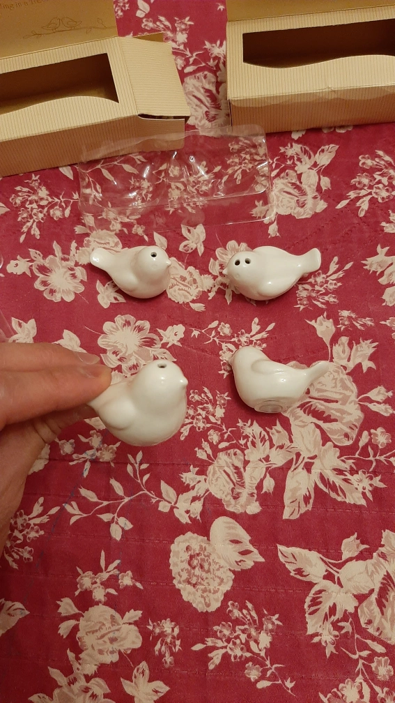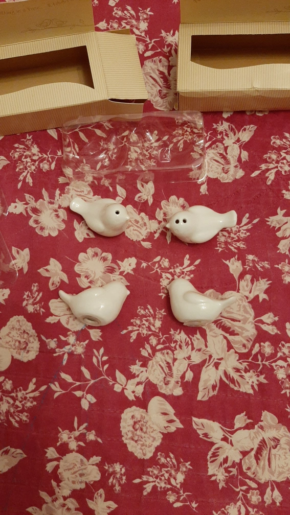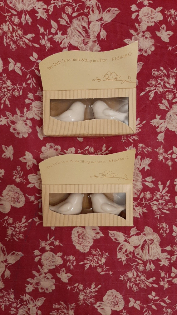 New & never used. Adorable ceramic love birds. Perfect for your kitchen. Four shakers included. Two pairs in separate boxes.