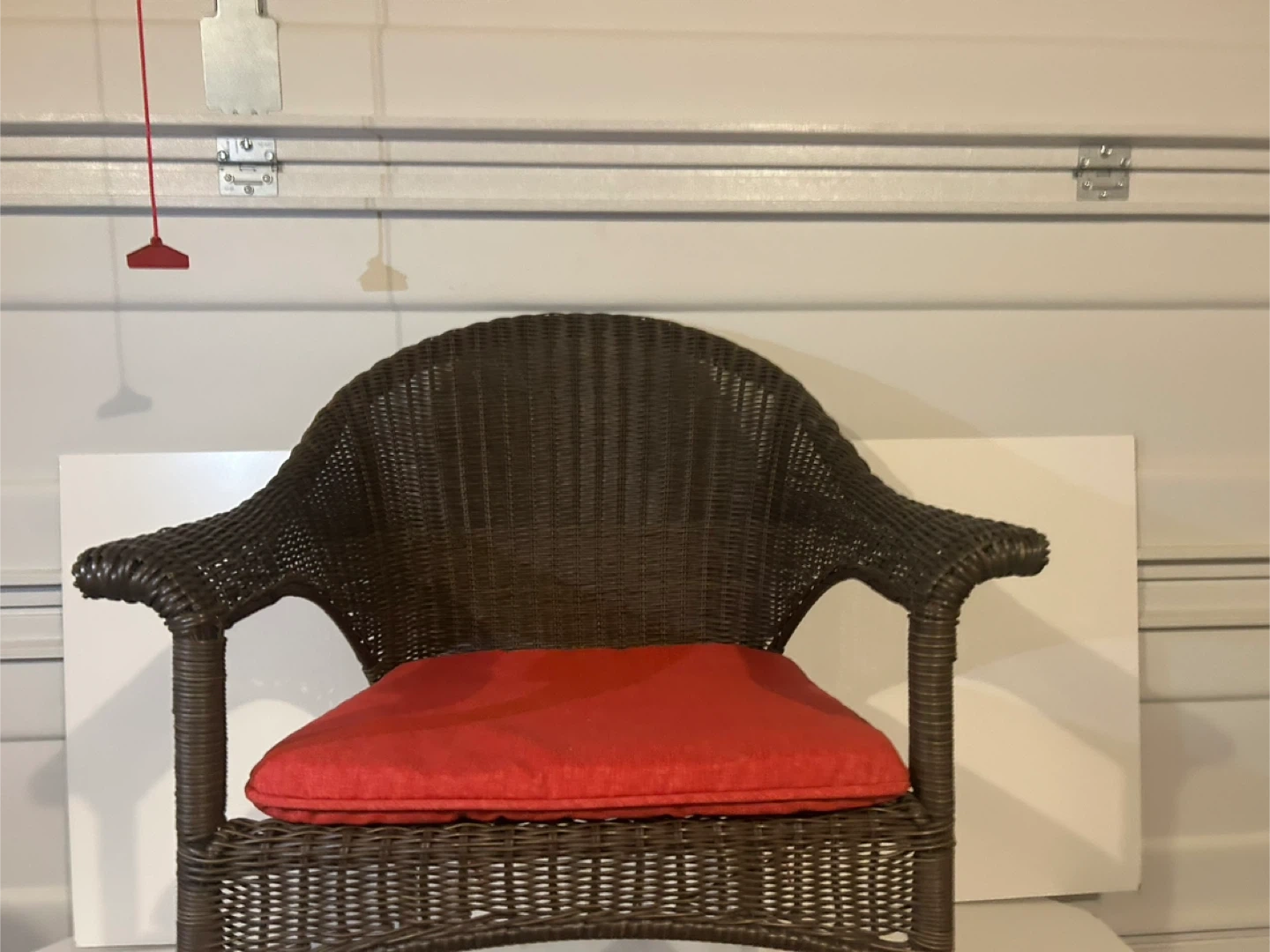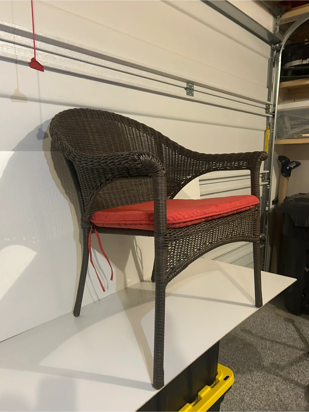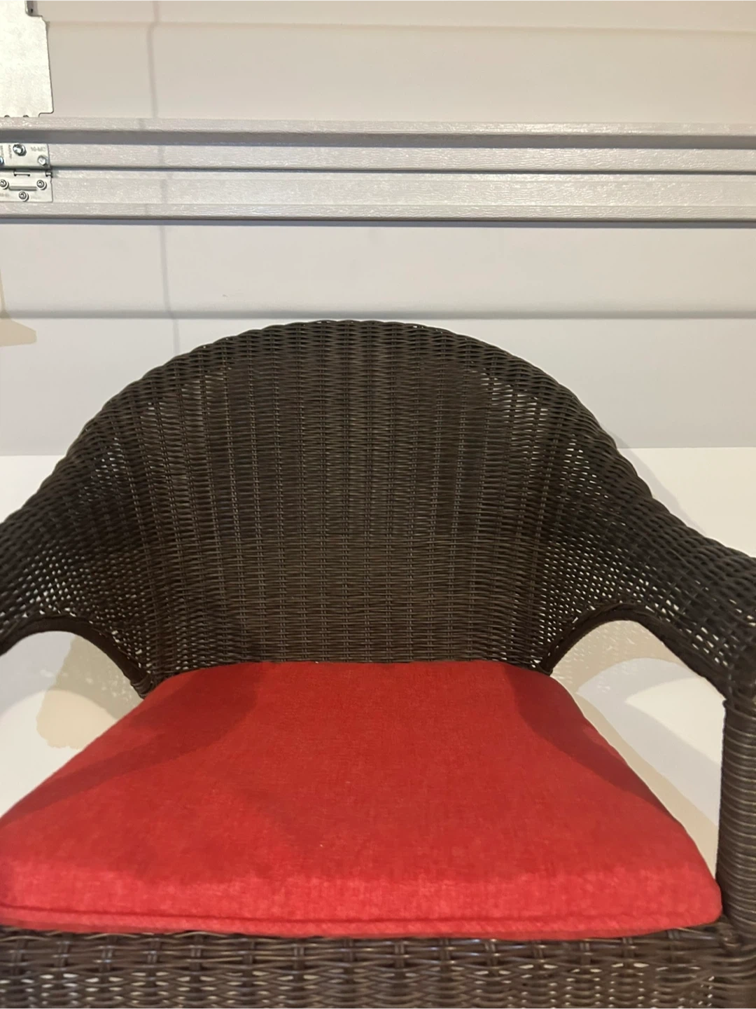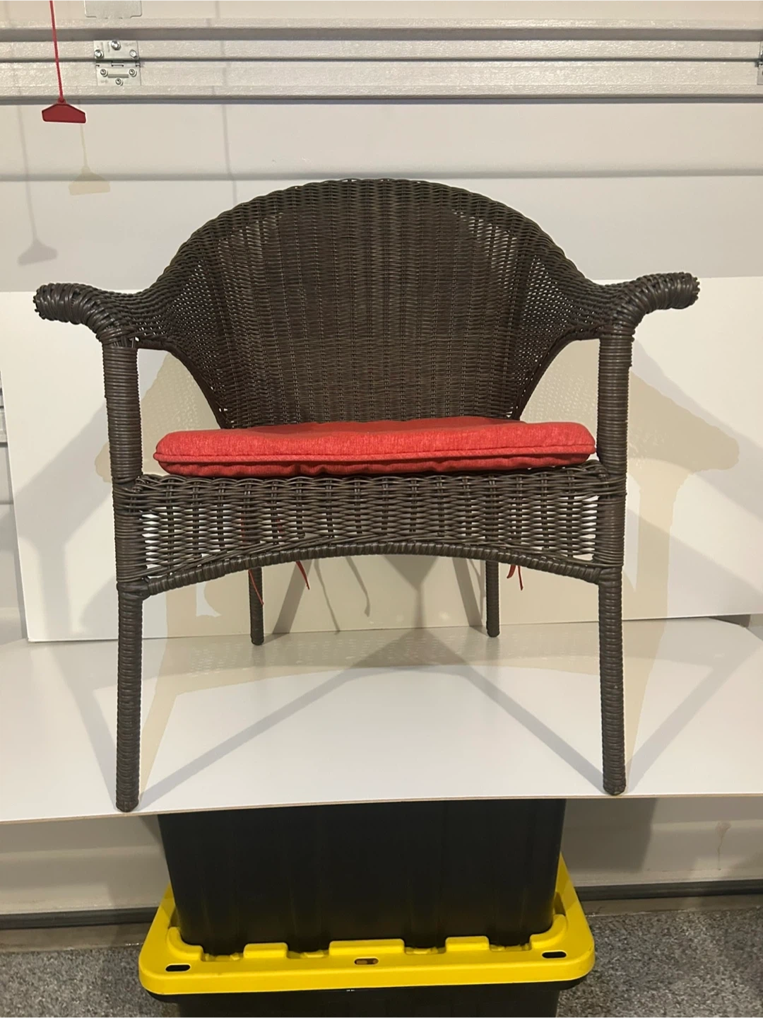 Set of 4 Comfortable wicker chairs with a red cushions for added comfort! Perfect for your patio or sunroom. The chair is in great condition and ready for a new home
