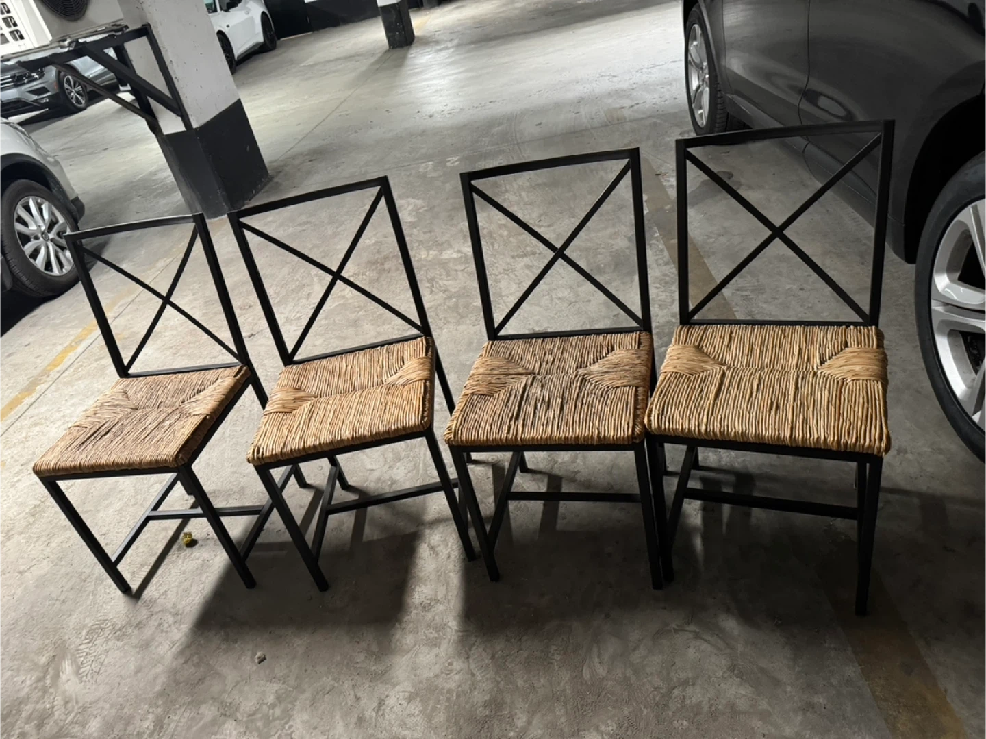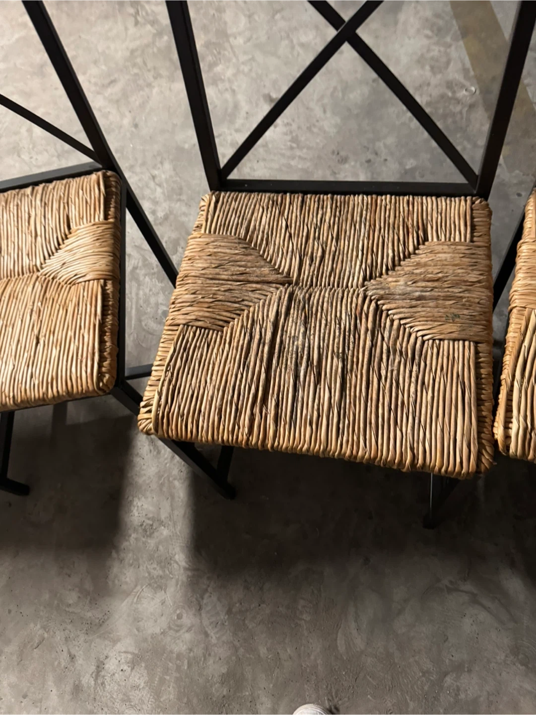 Selling a set of four chairs with wicker seats and black metal frames! They're in great shape and would look lovely in a dining room or kitchen