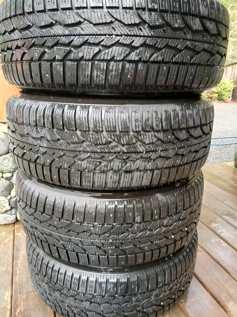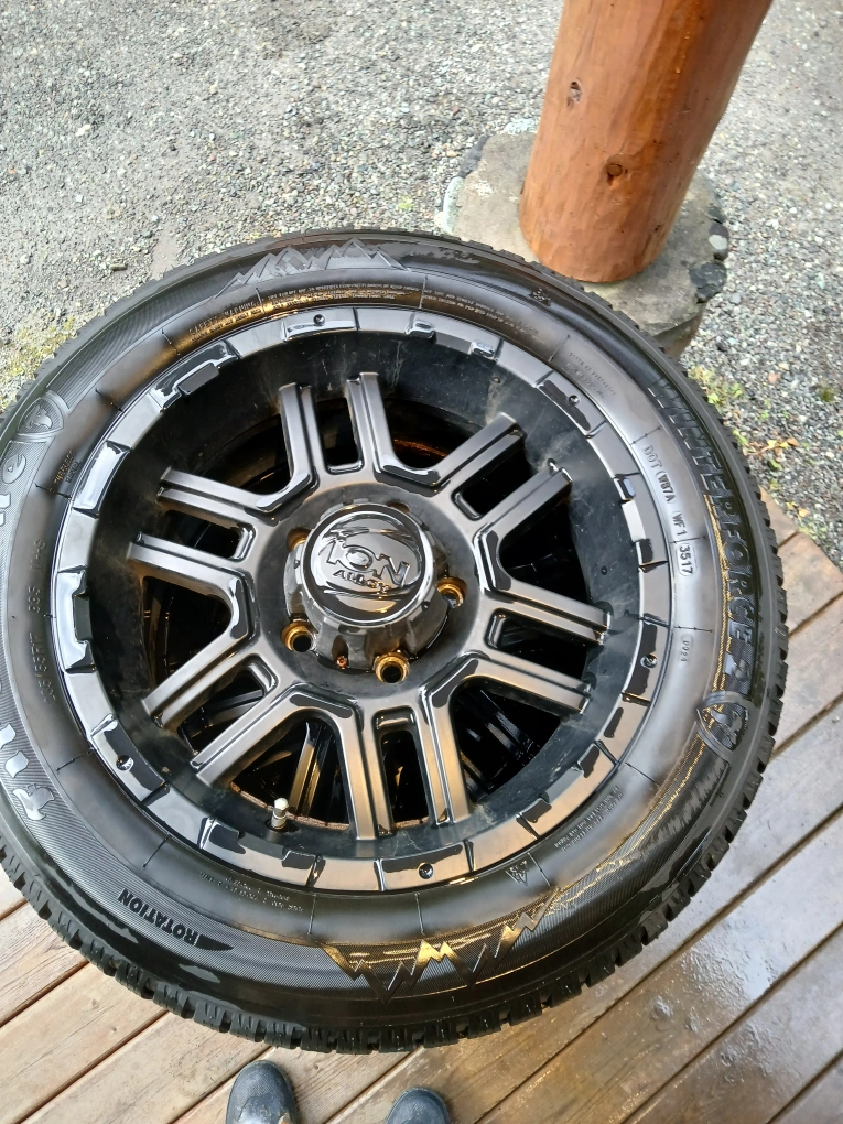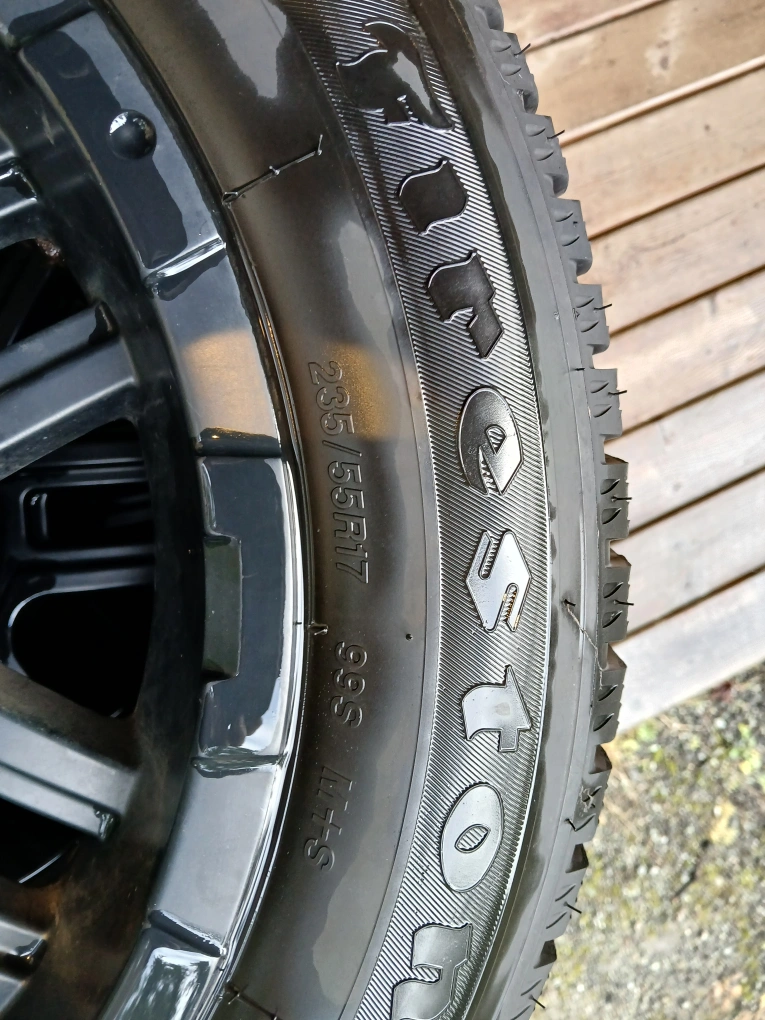 Set of 4 winter tires and rims. Studded tires. Near new condition. Nibs still on studs. 235/55 R17. Firestone Winterforce. were on a 2004 Suzuki Grand Vitara. 5x139.7. 5x5.5 bolt pattern.