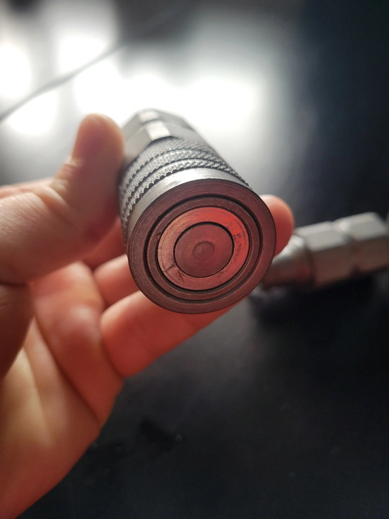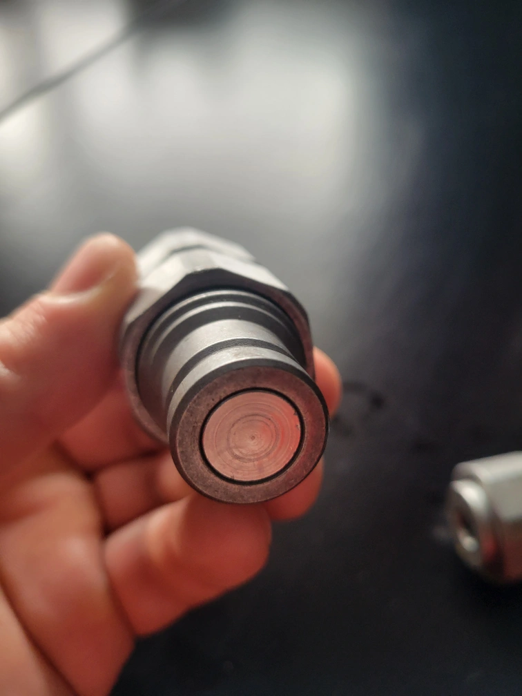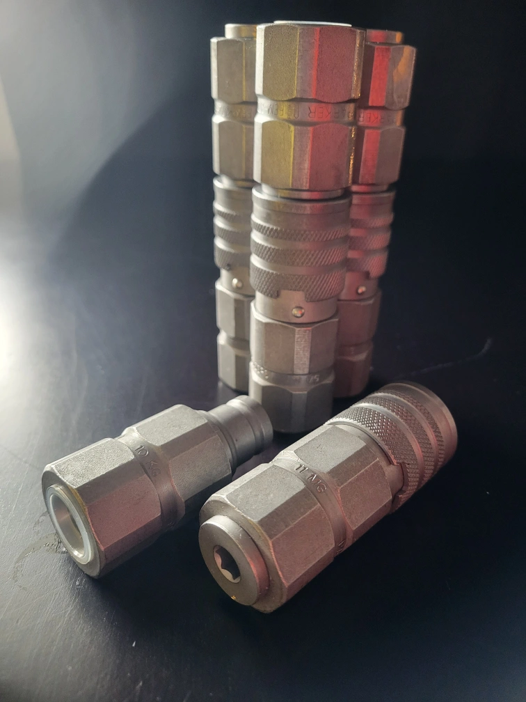 Five industrial-grade hydraulic couplers. Metal construction. Various sizes and types. Used but in good condition.