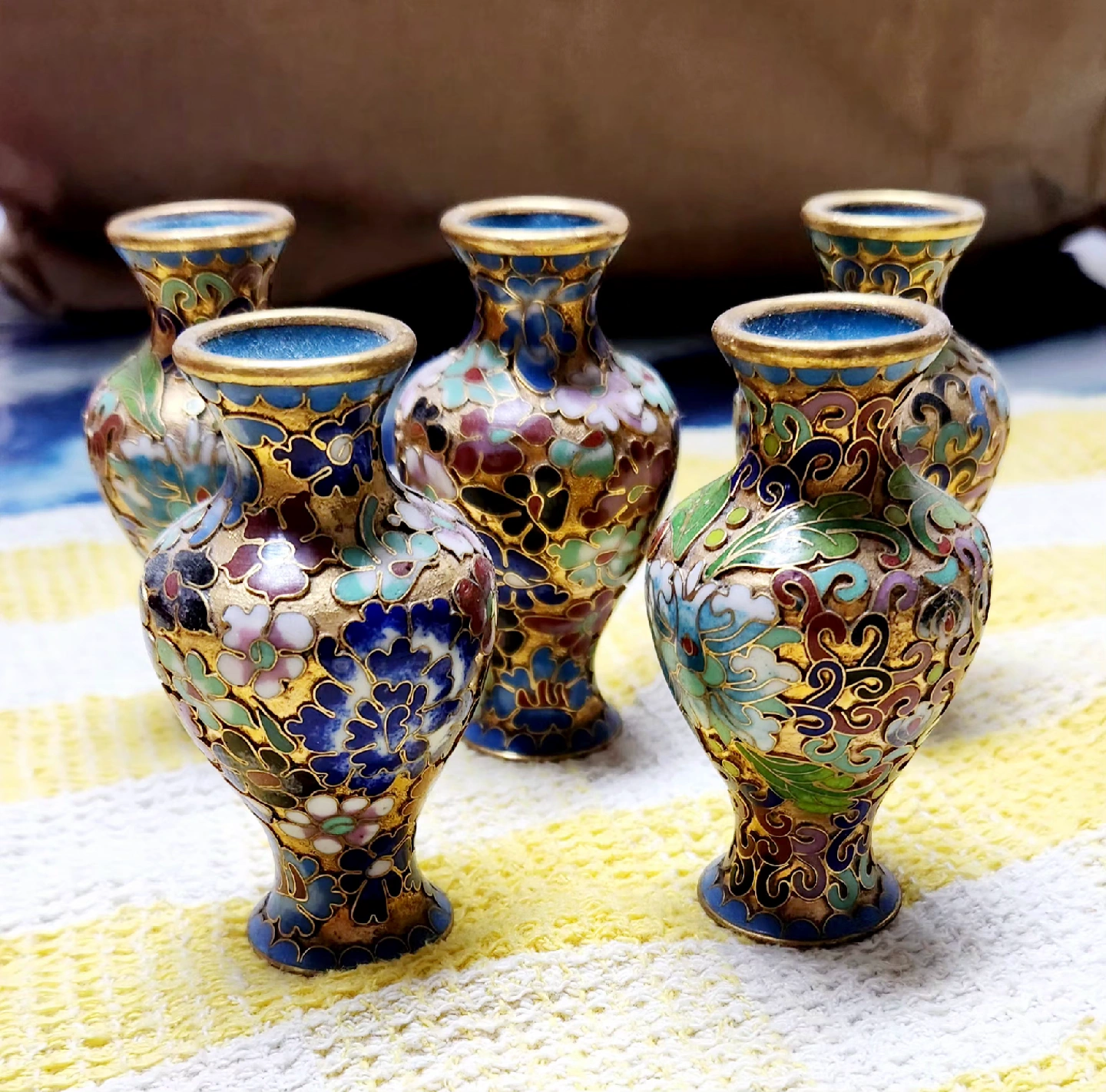 Here's a set of five miniature cloisonné vases! They feature intricate floral designs with gold detailing and colourful accents. Perfect for adding a touch of elegance to any space