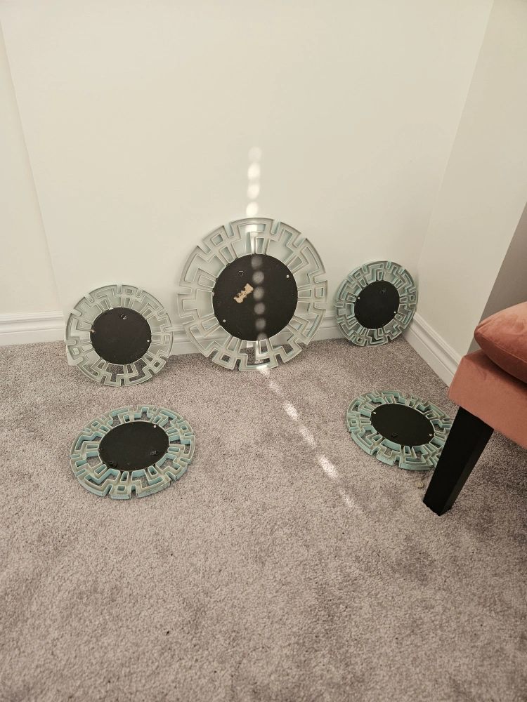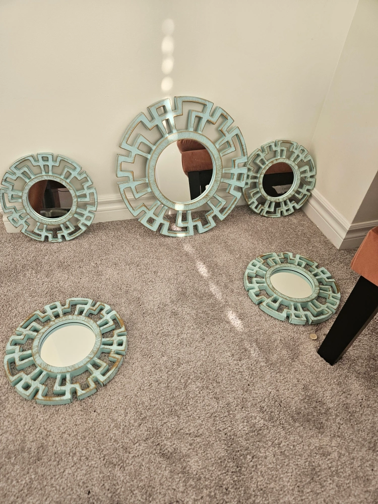 Selling a set of 5 round decorative wall mirrors. They feature a unique geometric design in a light blue colour. These mirrors would add a stylish touch to any room