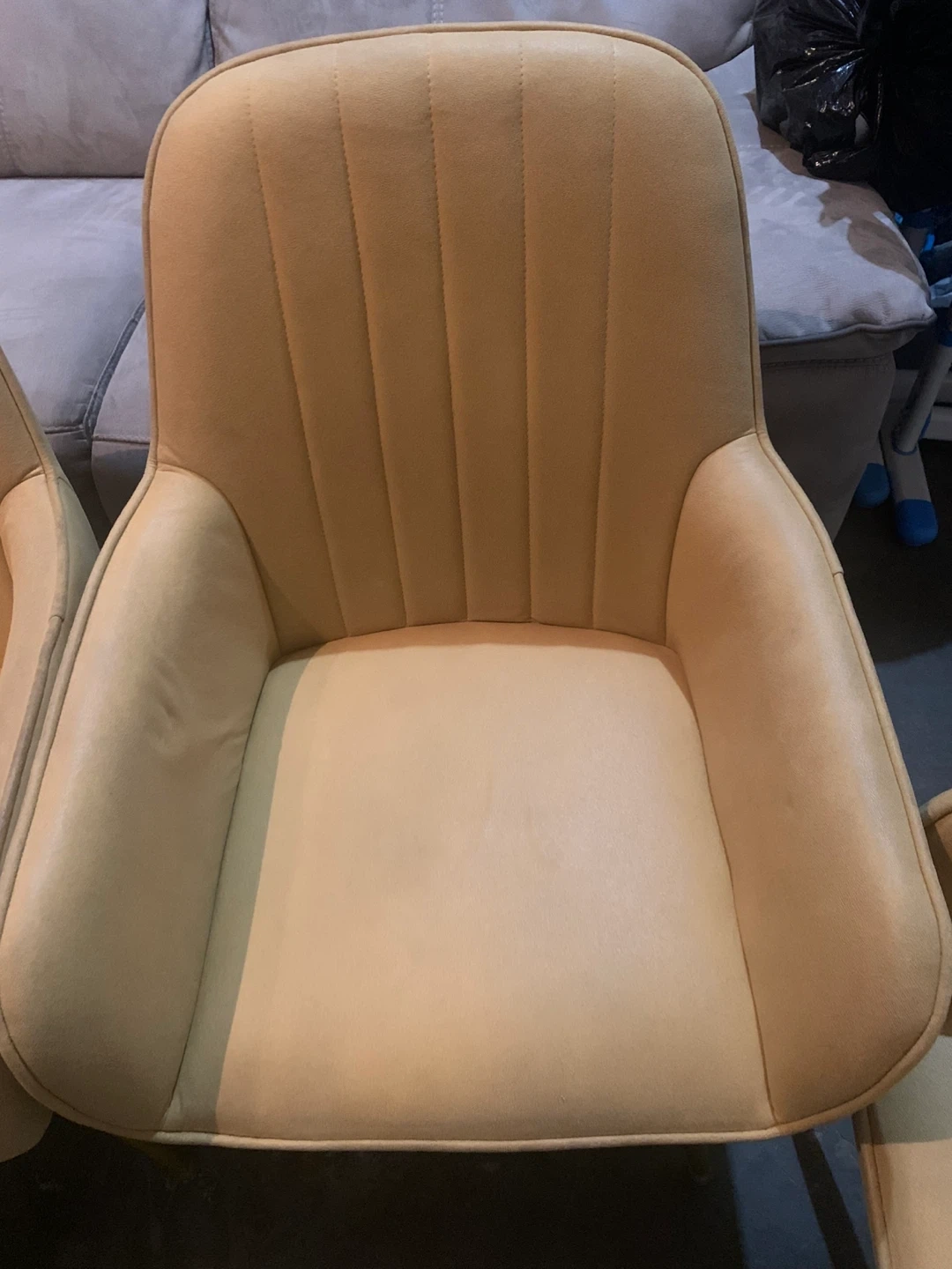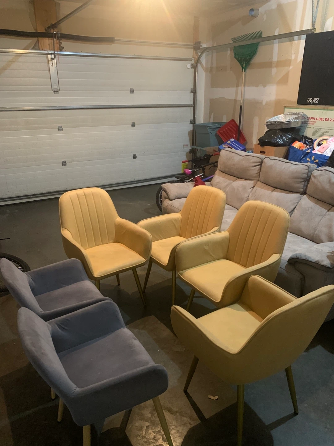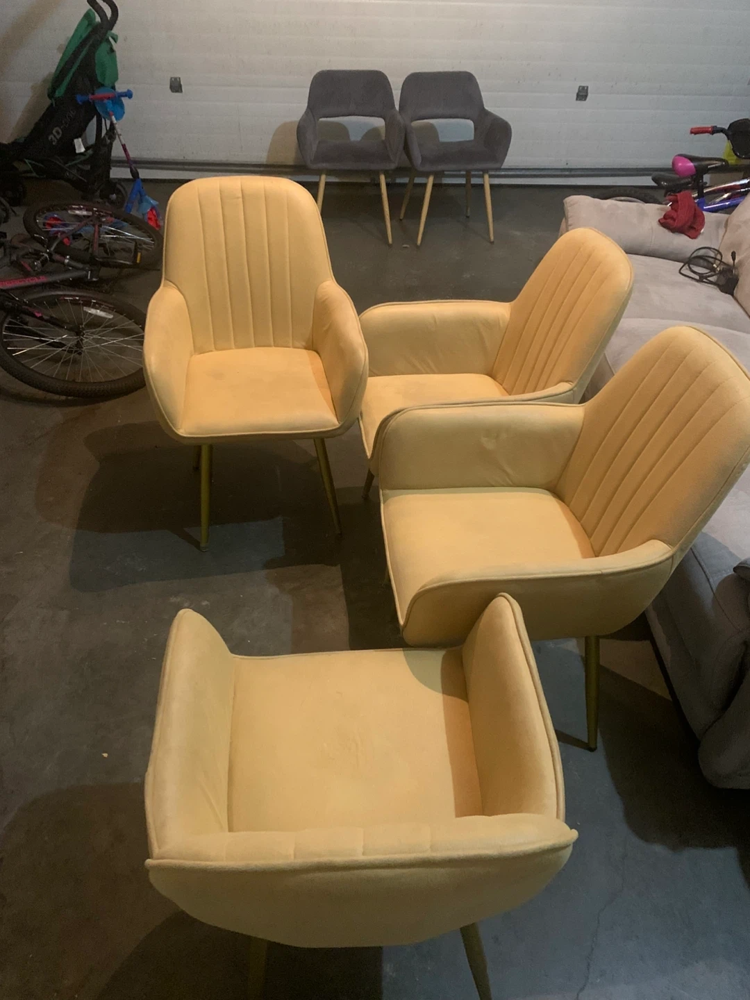 Selling a set of six accent chairs! You'll get two in a stylish grey and four in a sunny yellow. They're perfect for adding a pop of colour and modern touch to any room