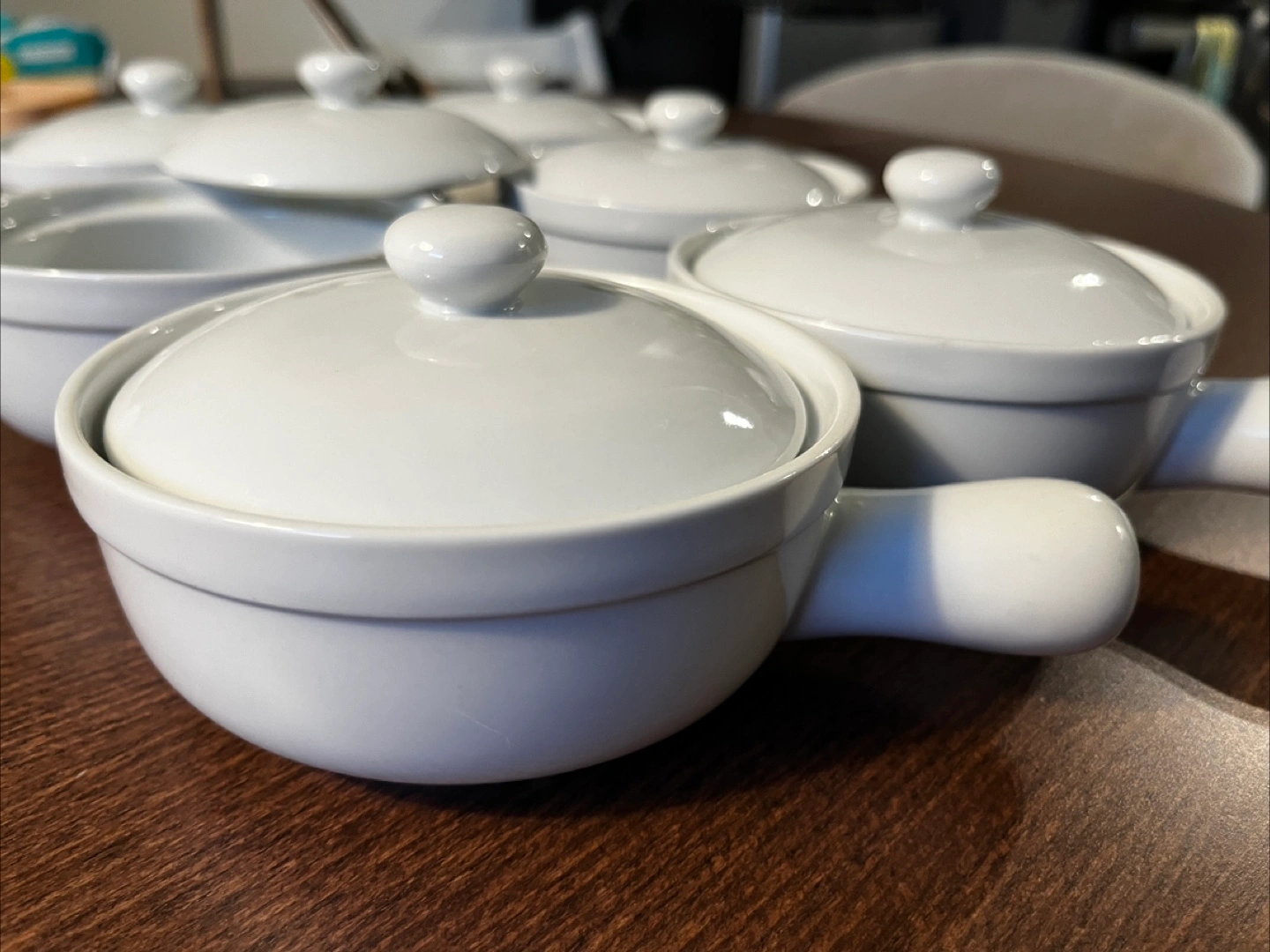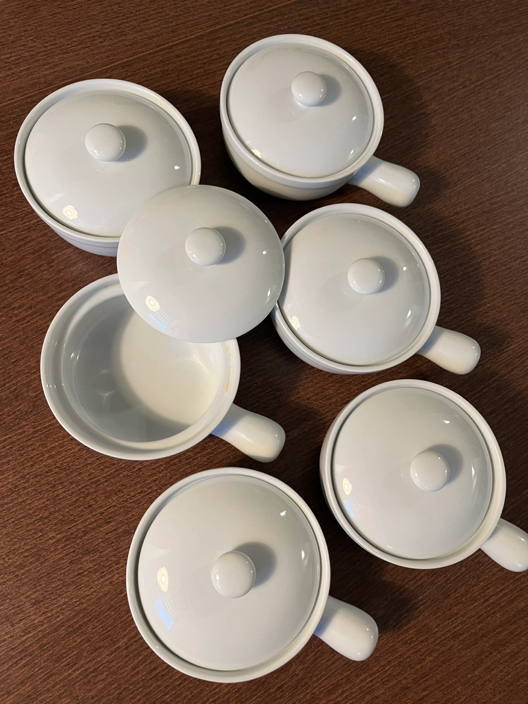 Selling a set of six lovely white porcelain soup bowls, each with its own lid! They're in great shape and ready to serve up your favourite soups and stews. Perfect for cozy dinners or entertaining guests