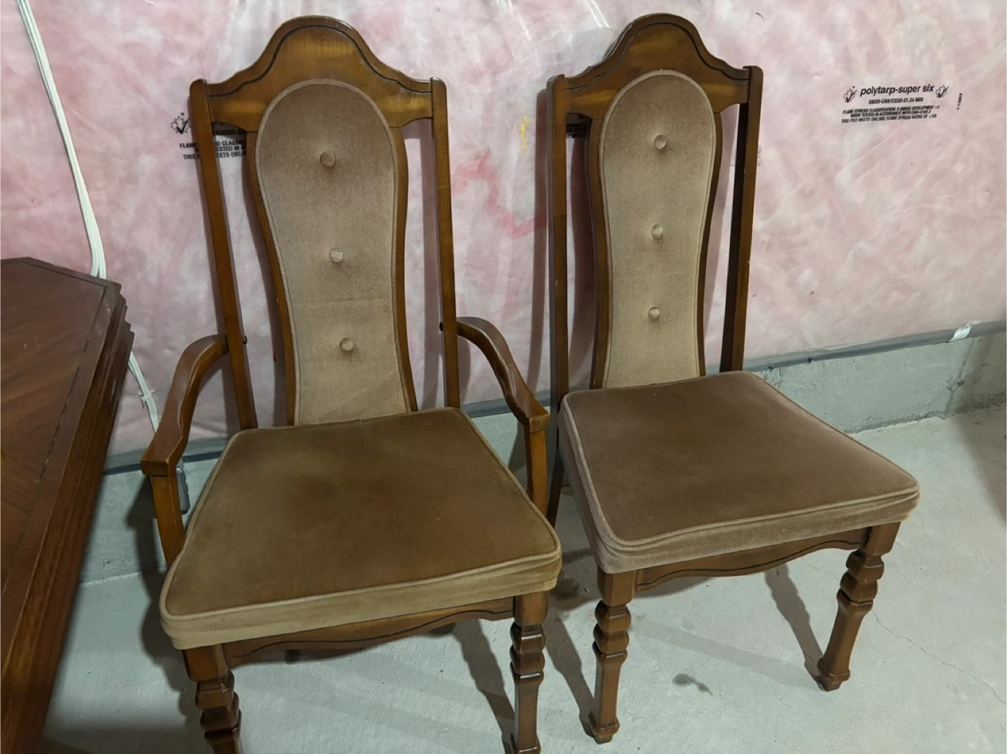 I'm selling a set of 6 vintage chairs! They feature a lovely brown upholstered seat and back, with a classic wooden frame. One chair has armrests, while the other doesn't. They'd be a great addition to any dining room or living space! Total 2 main chairs and 4 side chairs