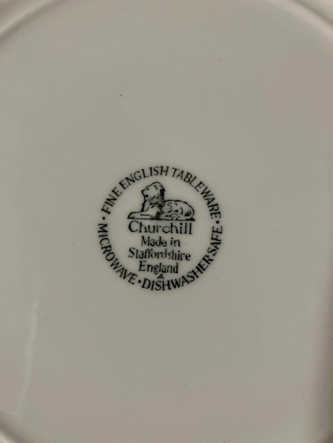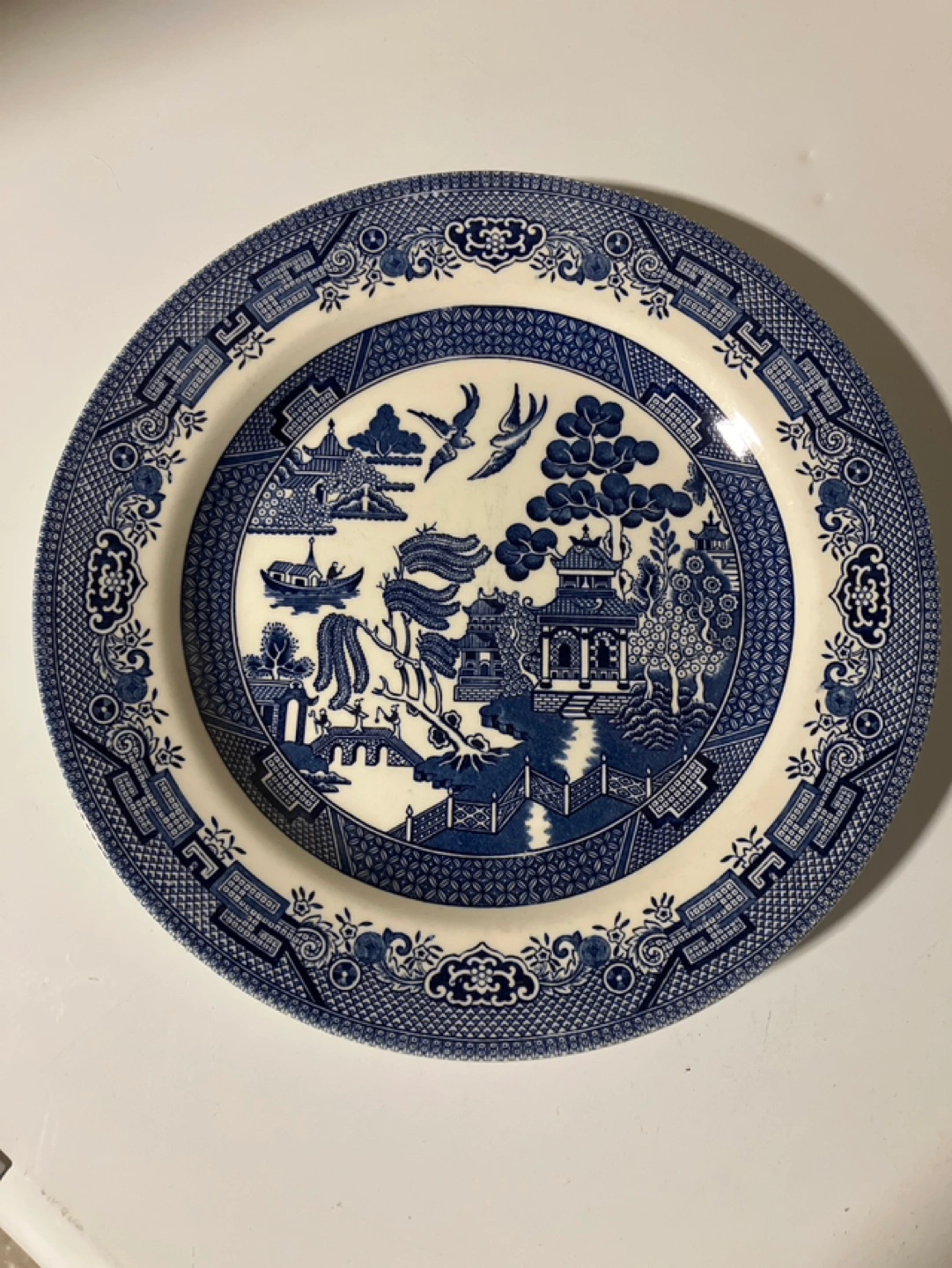Set of 7 Blue Willow dinner plates by Churchill. One plate has a chip on the backside (see photo). Other 6 are in excellent condition.
