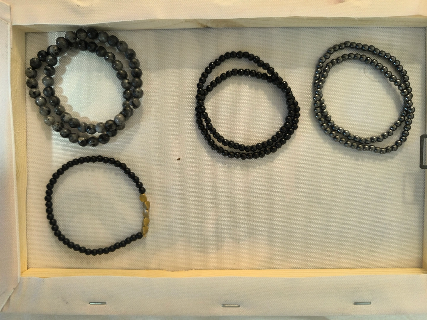 Selling a set of beaded bracelets. There are a pair of four type bracelets in total with different colours and bead styles. They are in great condition! all including the oynex the gray are 6mm diameter stones that are natural labradorite 10 for each 16 for two the black stones are 4mm diameter onyx bead stones 8 dollars each 15 for two and the metallic gray 4mm are Men's Hematite GROUNDING/PROTECTION/CONFIDENCE-Root Chakra Bracelets-Healing Gemstone Bracelet-Yoga Boho Jewellery-Meditation Focus Jewellery 8 dollars each 13 for two