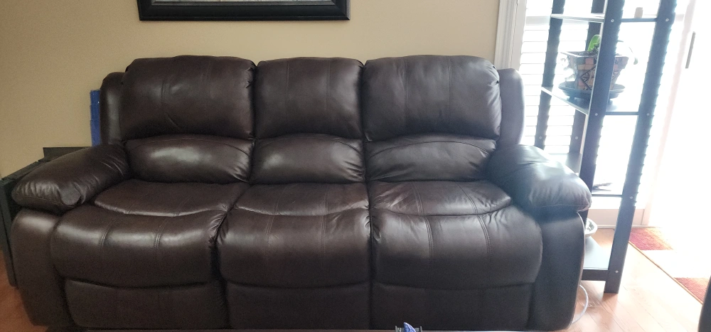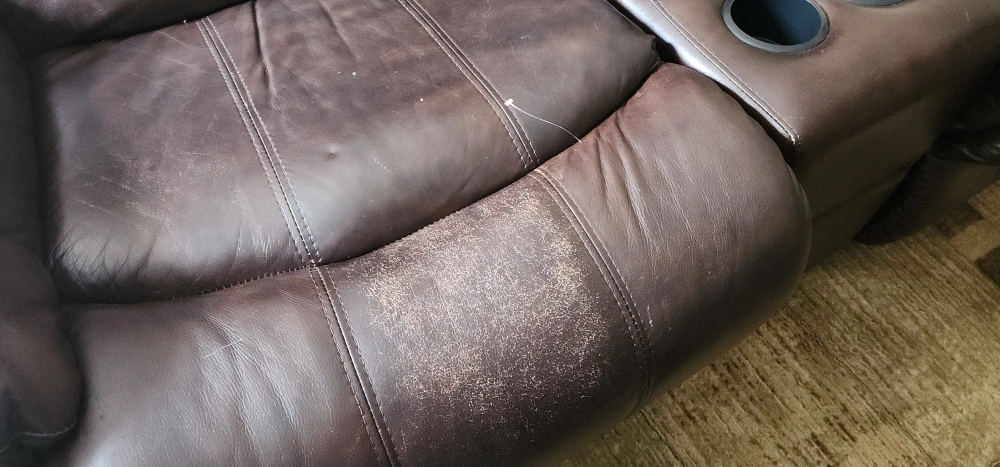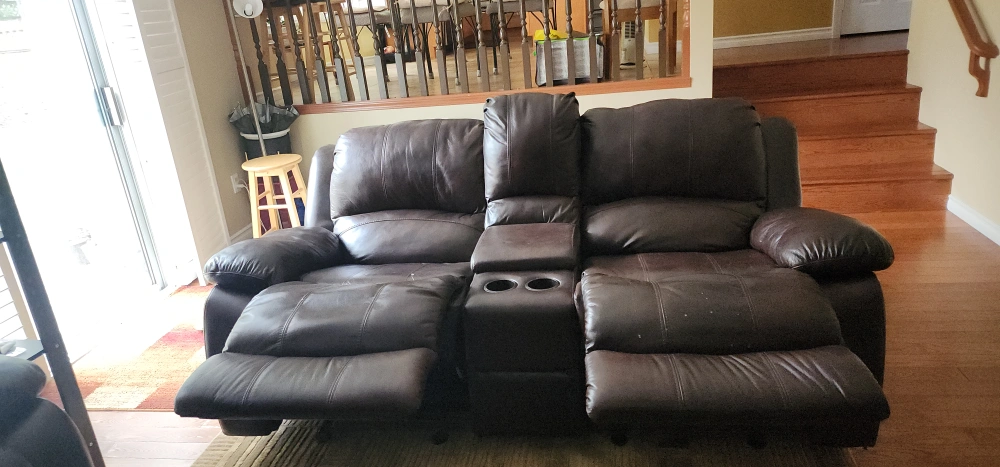 Selling a comfy brown leather reclining love seat sofa & 3 seats sofa. It's a great pieces for a living room or entertainment area. It features reclining seats and convenient cupholders in the middle section on the love seat , Please note there are signs of wear, as seen in the photos on the love seat. The 3 seater, also recline and harldy used.Less wear than the love seat.