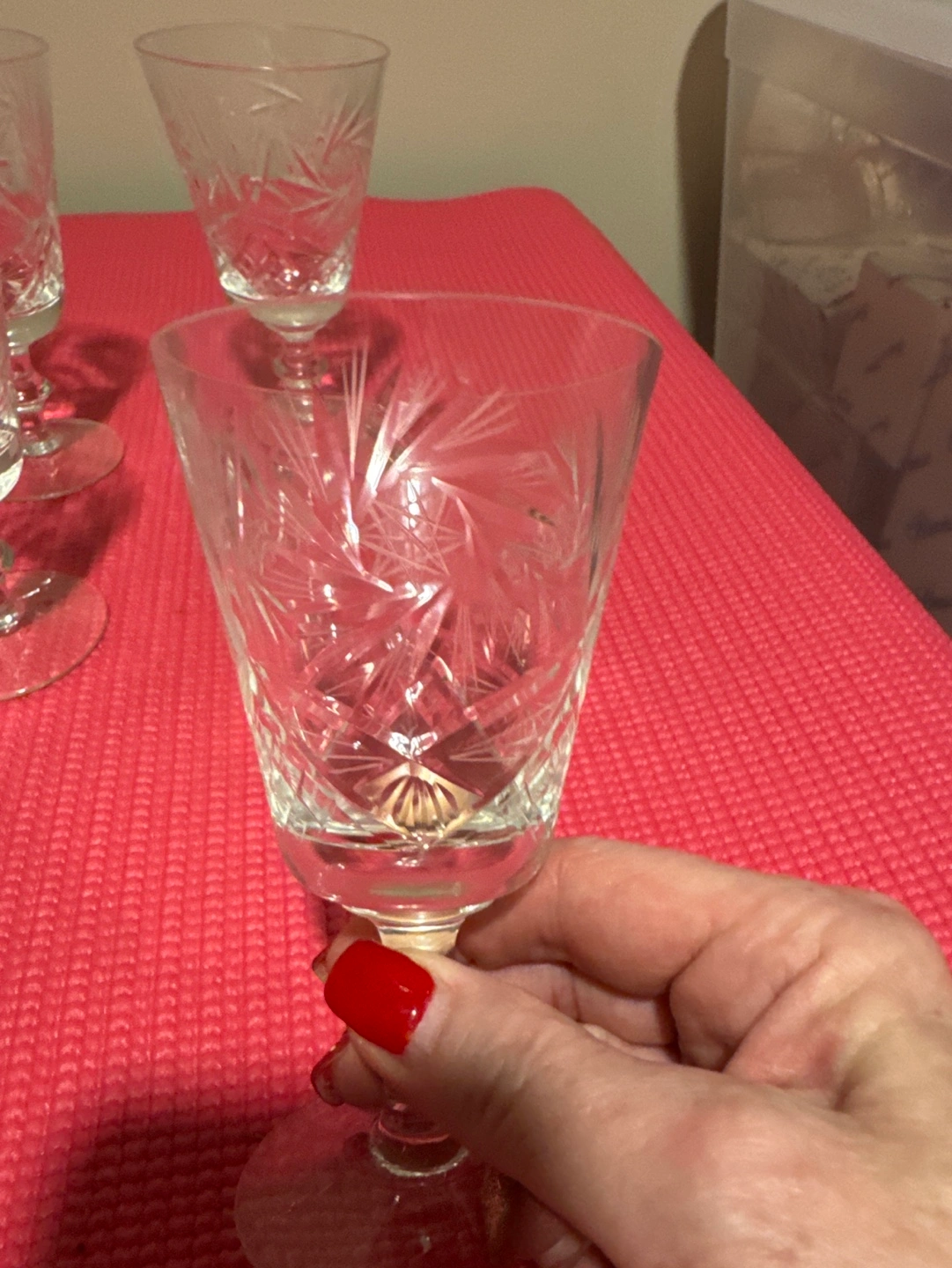 Four elegant vintage wine glasses. Pinwheel Crystal design. Beautiful addition to any table setting. Stemmed glasses, clear crystal like new condition. Price for set of 4. Would normally retail for over $50 or more.