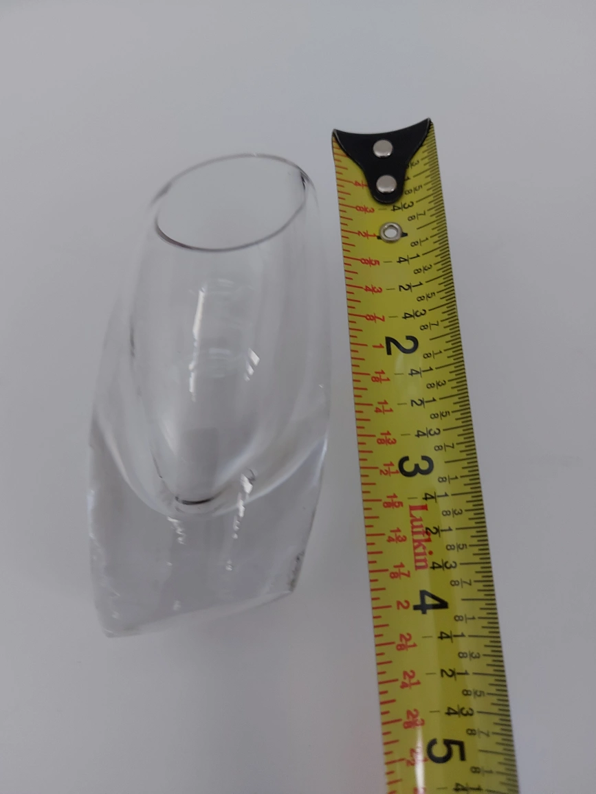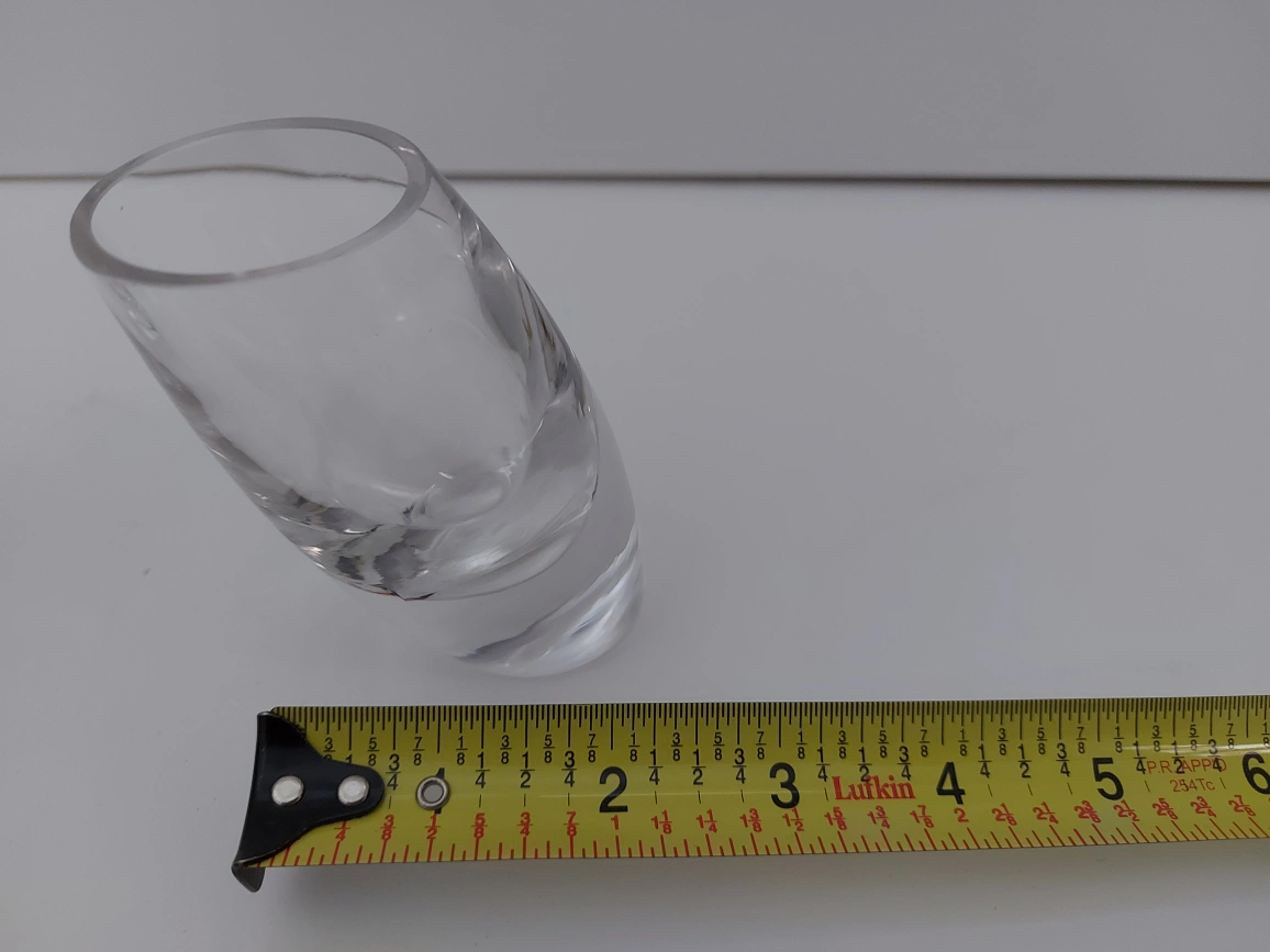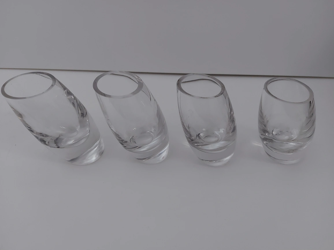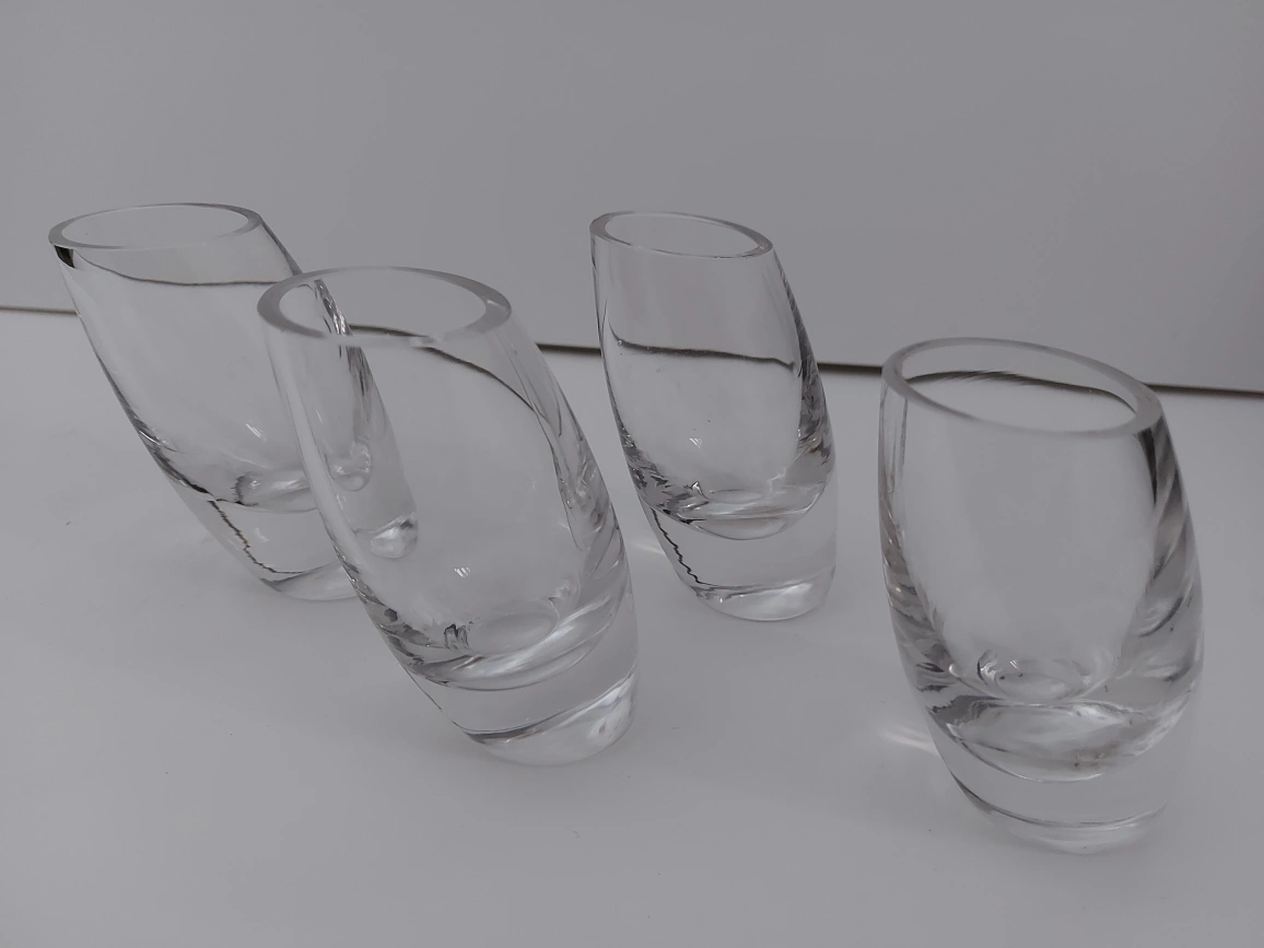 Four small, clear glass shot glasses. Unique, slightly curved, tilted design. Approximately 4 inches tall. Never used.