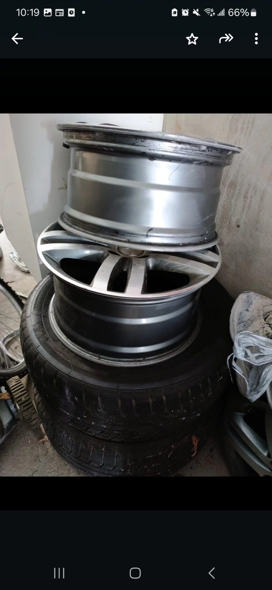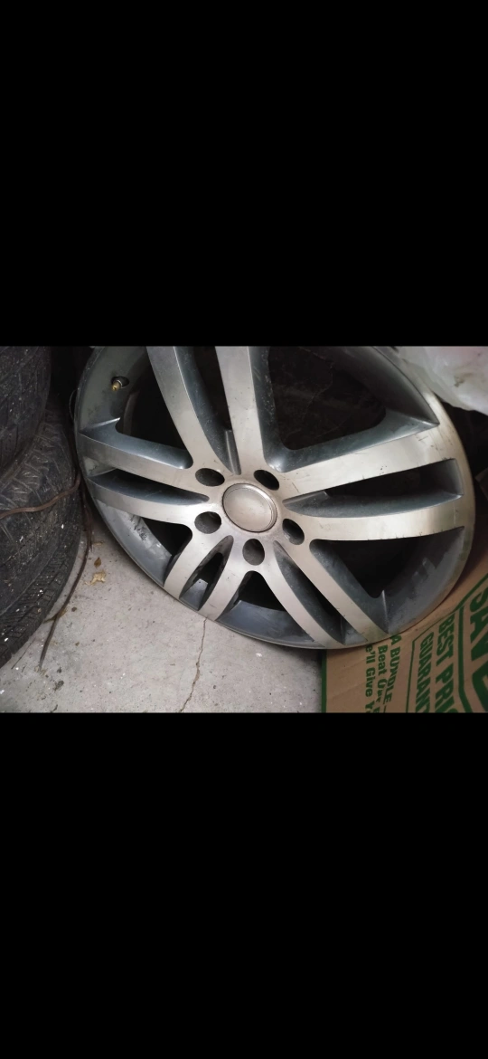 Four used aluminum alloy rims. Silver coloured, five-spoke design. Some minor scuffs and scratches. Sold as is. tires included half life size 255/55/18