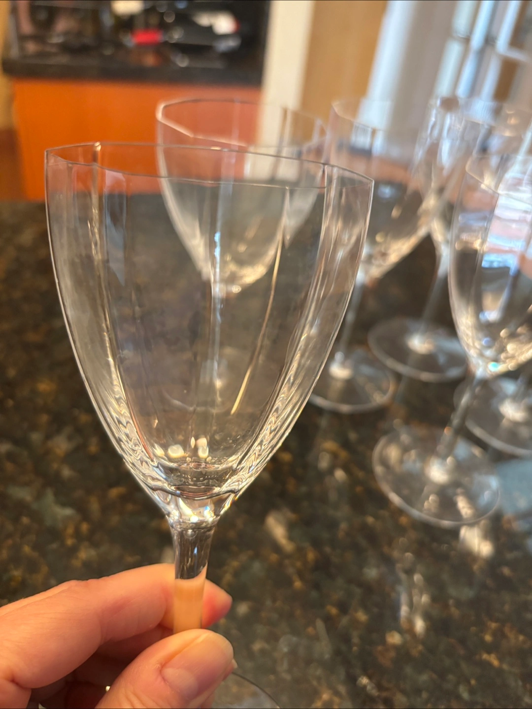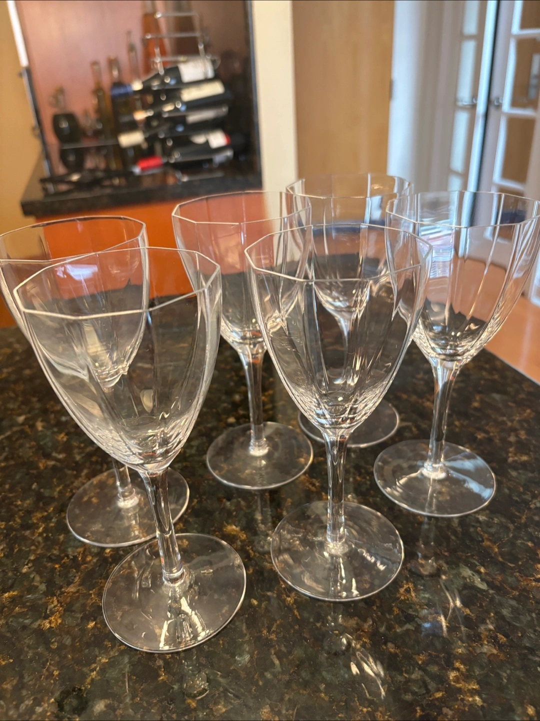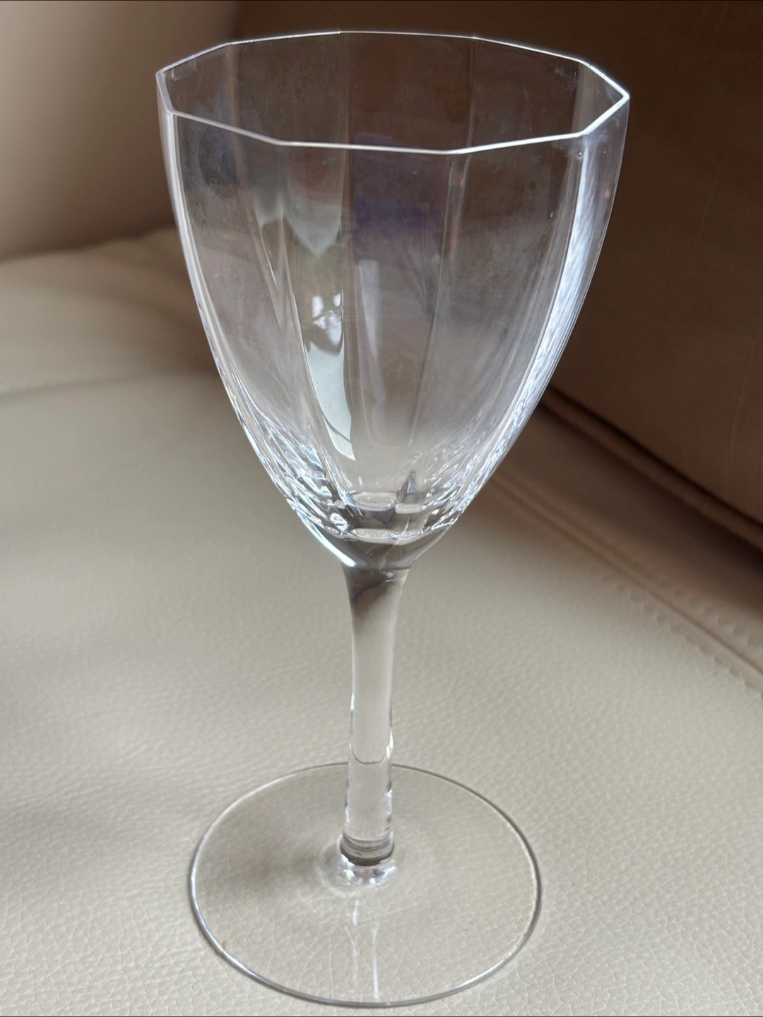 Six lovely, clear wine glasses. Octagonal bowl shape. Long stems and wide bases. No cracks or chips. Excellent condition. From a smoke and pet free home. Pickup only in the St Lawrence market area of downtown Toronto. Cash only.