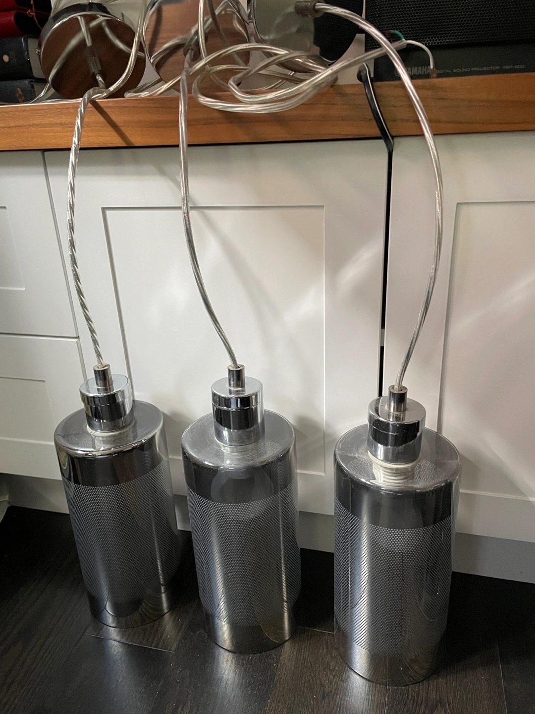 Three cylindrical pendant lights. Chrome finish, Minimalist style, perfect for kitchen island. Includes wiring. Height is adjustable Porch pick up Yonge and 16th