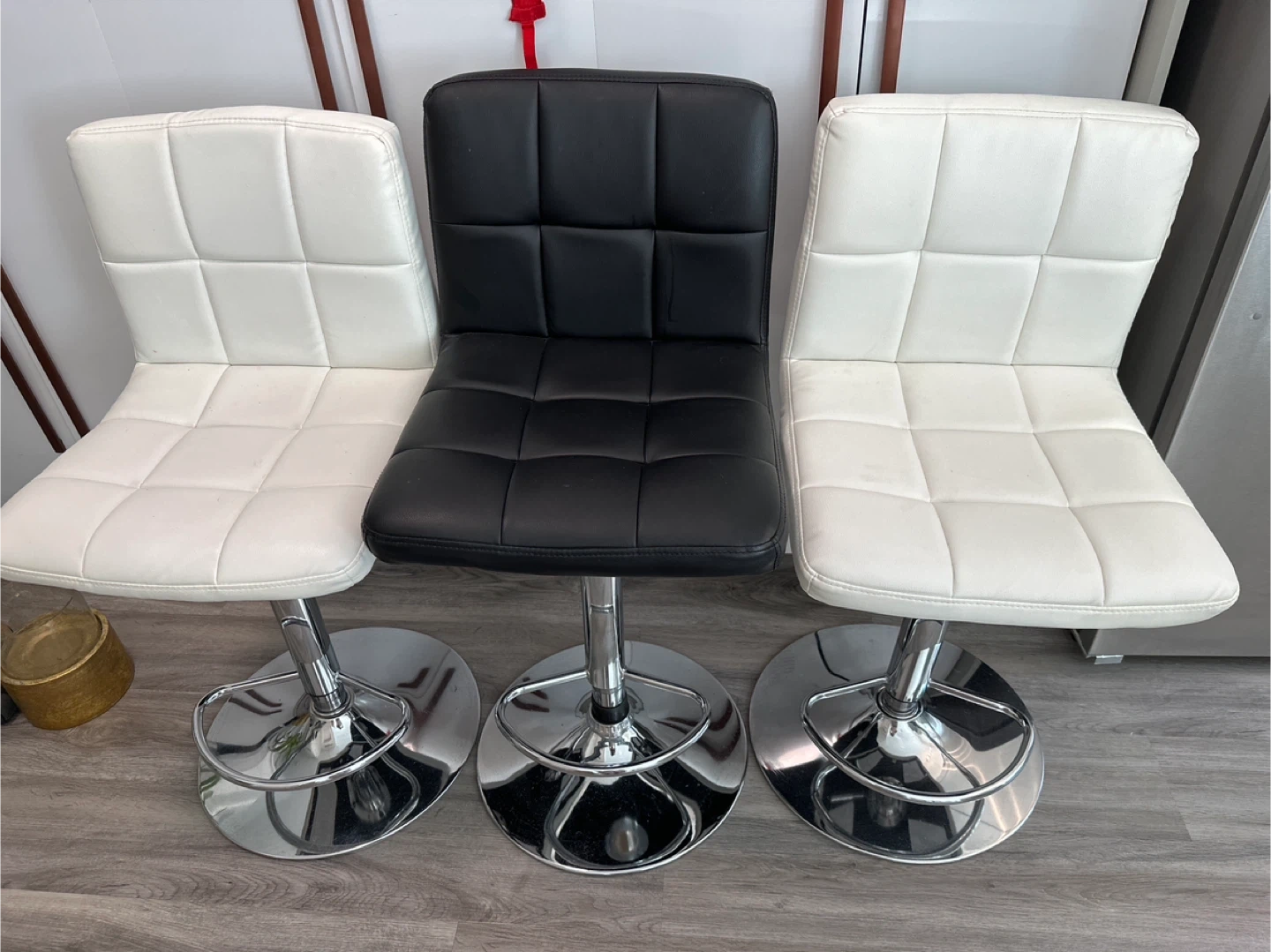 Here are some bar stools in great condition! There are two white stools and one black stool. They are made of leather and chrome and are very sturdy. Price is for all three.