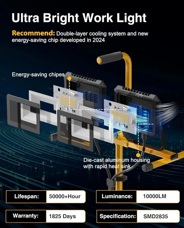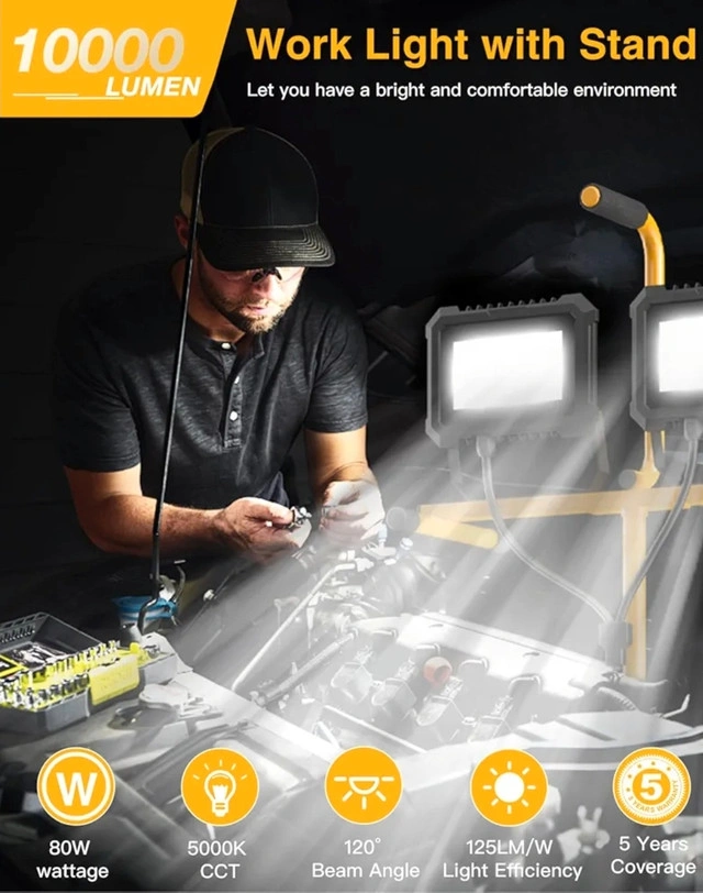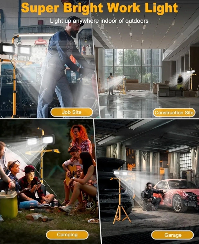 Set of two (2) BRAND NEW Work Lights. Comes in original sealed never-opened box. * Each box contains 2 tripod stands, and 4 adjustable head Work lights Retails at Amazon for $215 ($190 + tax). Save your money. Pickup from south London. I can deliver in London for an extra fee. JC-LGL 80 Watts LED Work Light with Stand, 10000 Lumen 2 Adjustable Head Work Light, with Adjustable and Foldable Tripod Stand, Waterproof Lamp with Individual Switch for Construction Job Site Workshop Garage, 2 Pack Product details: Brand: JC-LGL Style: 80w 2pack Shape: Rectangular-Lamp-shaped Material: Aluminum Finish type: Powder Coated Light source type: LED Shade material: Aluminum Power Source: AC Voltage: 120 Volts (AC) Brightness: 10000 Lumen Light Source Wattage : 80 Watts Mounting Type: Floor Mount Light Colour: 5000k 【Super Bright & Energy Saving】: 10000LM super bright LED work light with stand, 80W 5000K dual-head work lights. it lit up your work place like daylight, easily focused light on your requirements in different conditions and comfortable environment with minimal energy consumption. 【Perfect Design & Great Flexibility】: The heavy-duty telescoping tripod can be easily folded for transport or storage, and can be easily adjusted to several different heights, extending from minimum 23.62in to maximum 59.06in, to meet your need during work. each work lamp head is equipped with individual switch, the LED work lights with stand are detachable and can be used with the handle independently, illuminate the entire garage and garden with a higher illumination range compared to other work lights on stand. 【Rotatable LED Work Lights】: LED work lights head can be rotated 360° horizontally and 180° vertically, adjust the lighting angle in multiple directions, only adjusting the lights but not moving the whole appliance, it lit up any place where lighting is needed or illuminate 2 different directions at the same time! whether you're on a construction site, job site, industrial, working in a garage, or sitting in a campground, our work lights will accommodate your needs! 【Efficient Heat Dissipation & Long Life】: LED work light with stand die-cast aluminum housing adopts fin type heat sink design to increase air contact area, effectively accelerate heat dissipation. the security light is polished tic treated, not easy to rust and fade, it last for 50000+ hours, long service life, reduce the number of lamp changes, thus reducing manual operation. 【Durable Structure】: Easy to installation, each work lamp head is equipped with super-powerful LED lamp beads. work lights on stand die-cast aluminum housing with rapid heat sink, die-cast aluminum housing protects against minor drops, tempered glass, safety three-hole plug, rustresistant lamp shell, aluminum alloy bracket make up the high-quality tripod work light, IP65 waterproof design make the LED work light with stand study and durable even in the poor construction sites for long time, it is a high quality construction lights.