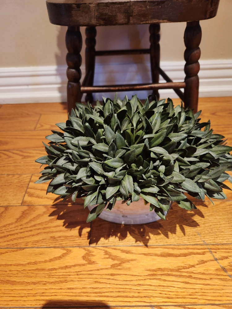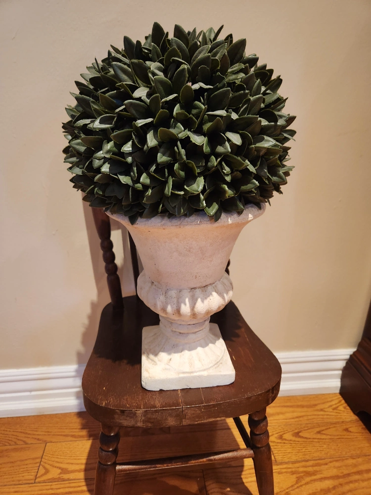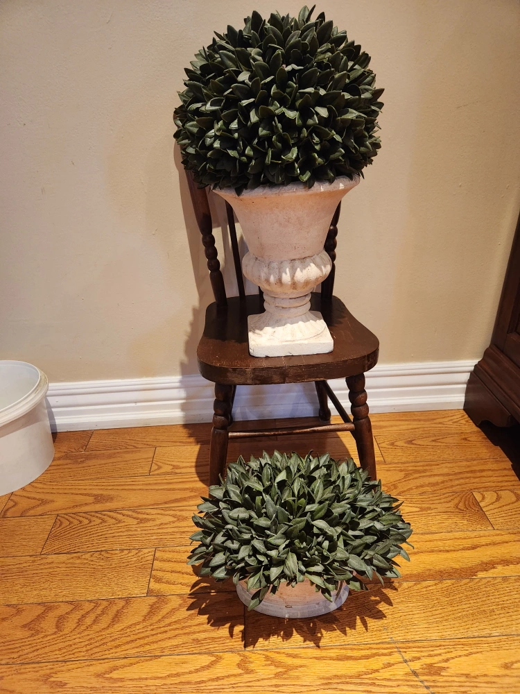 These beautiful fake flowers in a ceramic base are in mint condition. I had them as a decorated pieces They would look amazing in family room , bathroom or living room. The measurements are the one on the small chair is 15 inch, the smaller one is 8 inches high They are sold as a set. If interested please send me a message. See my other postings