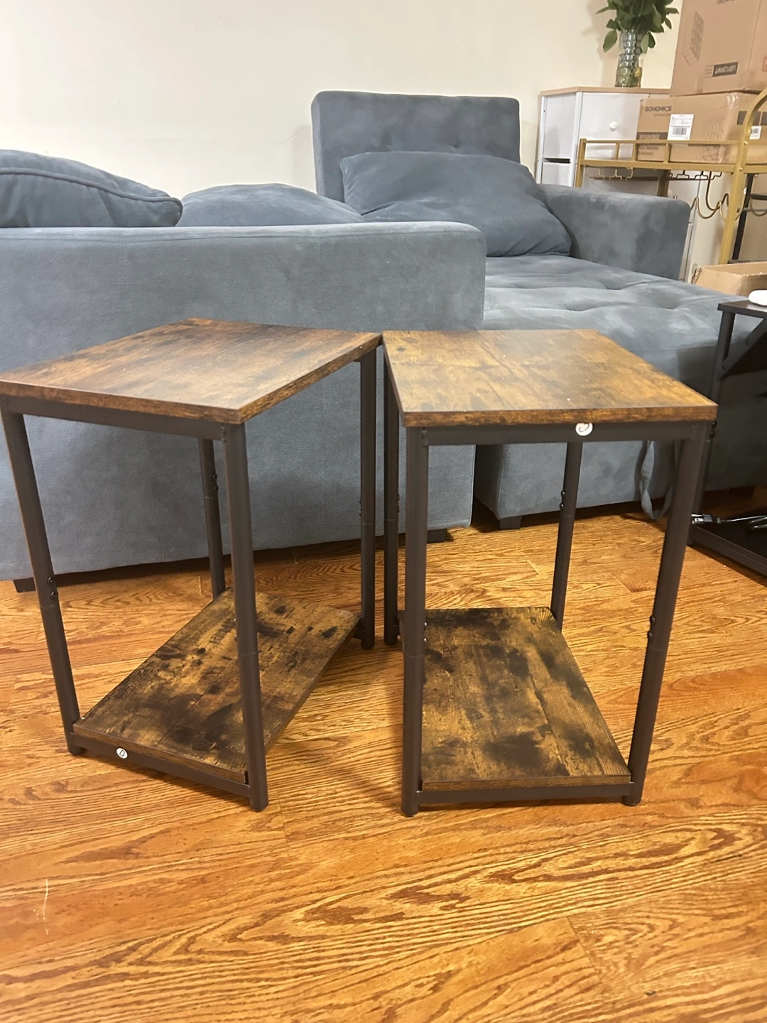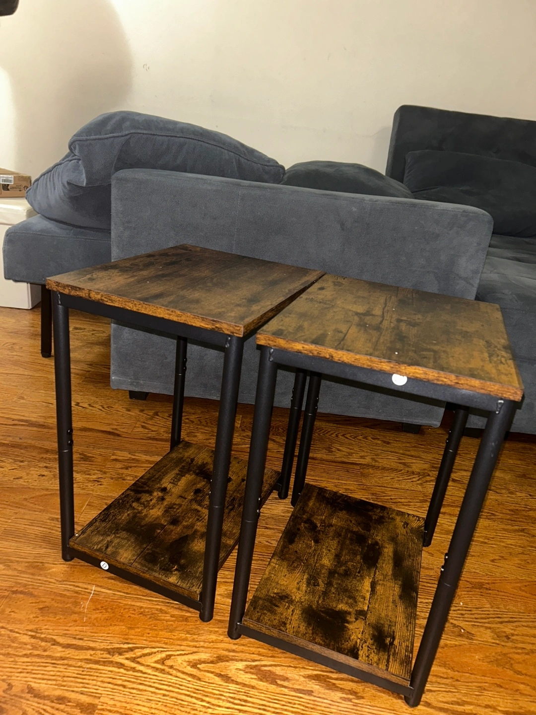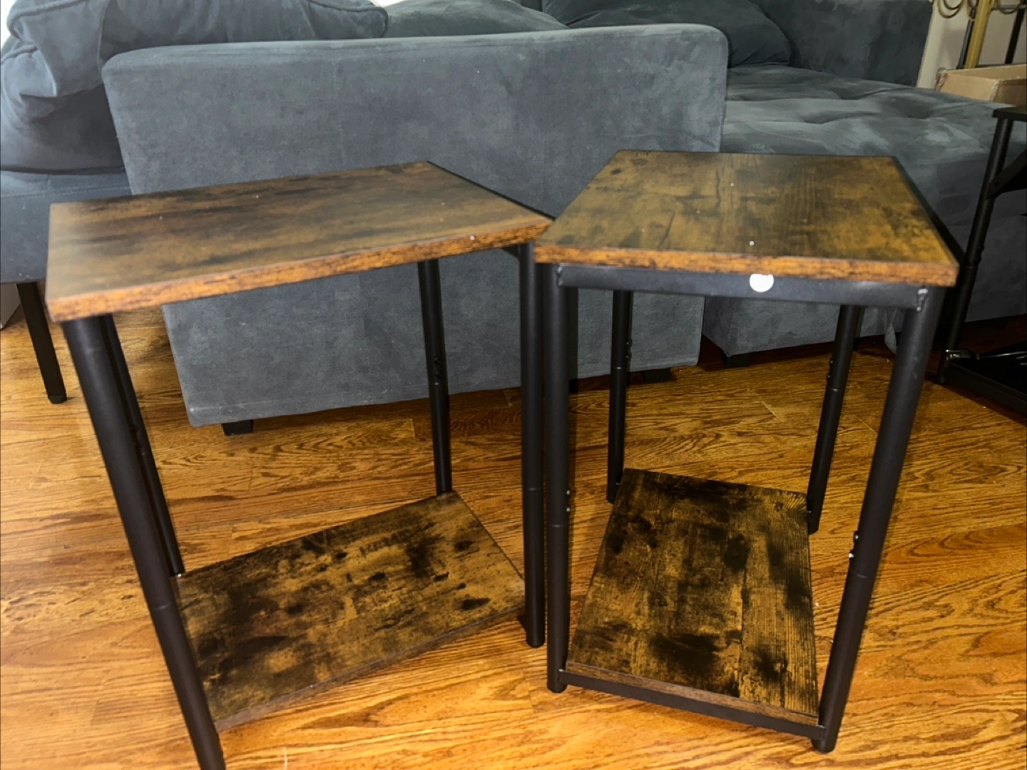 A matching pair of side tables. Dark brown tabletop. Black metal frames. The tables feature a lower shelf for extra storage. These side tables provide a perfect place to put a book and cup of tea.