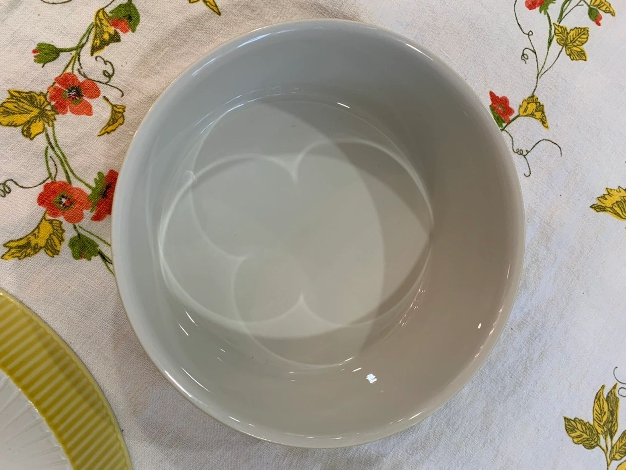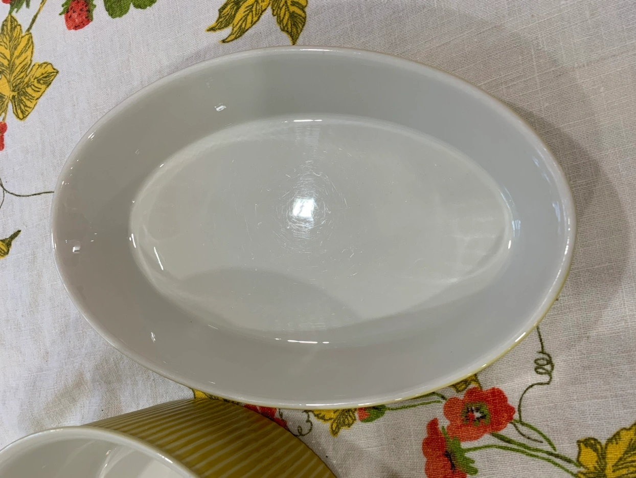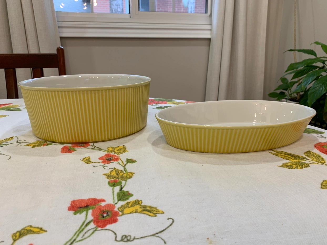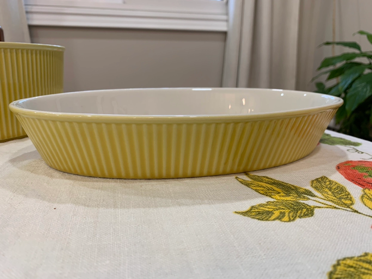 The round dish measures 9 & 1/2” across and 3 & 3/4” tall and the oval dish measures 11 & 1/4” wide by 6 & 7/8” and is 1 & 7/8” deep. Beautiful yellow rubbing on the outside and clean white interiors. The large round bowl looks as if it was seldom used and the oval dish shows very little wear with some light utensil marks. Both are stamped on the bottom: Villeroy & Boch Made in Luxembourg The round dish is stamped 1 and the oval dish is stamped 4. They would make a beautiful wedding gift. $100 for the pair. Pickup in Thornhill near Yonge Street and Royal Orchard Blvd. View my other listings for more vintage and unique finds.
