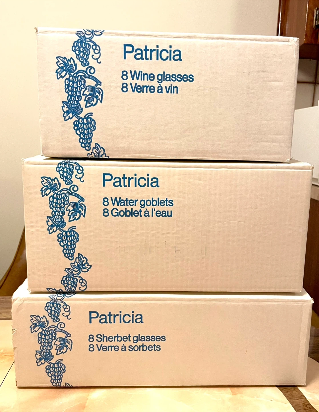 Selling 3 sets of 8 sparkling Patricia glasses, like new in their original boxes! You'll get 8 elegant wine glasses, 8 water goblets, and 8 sherbet glasses, each set in their own box. Perfect for adding a touch of elegance to your table setting! These classy glasses are in perfect condition! If it’s listed, no need to ask! IT’S AVAILABLE!! $10 per box or all three boxes for $25! Check out my other listings too!