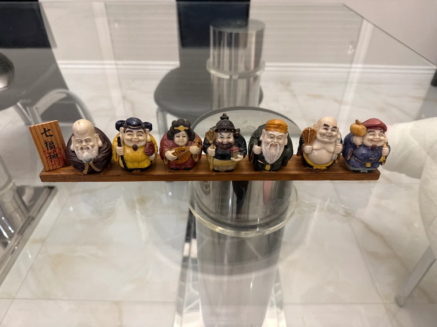 These are statues of the Seven Lucky Gods, a set of deities in Japanese mythology. They are displayed on a wooden base. They would make a great addition to any collection!